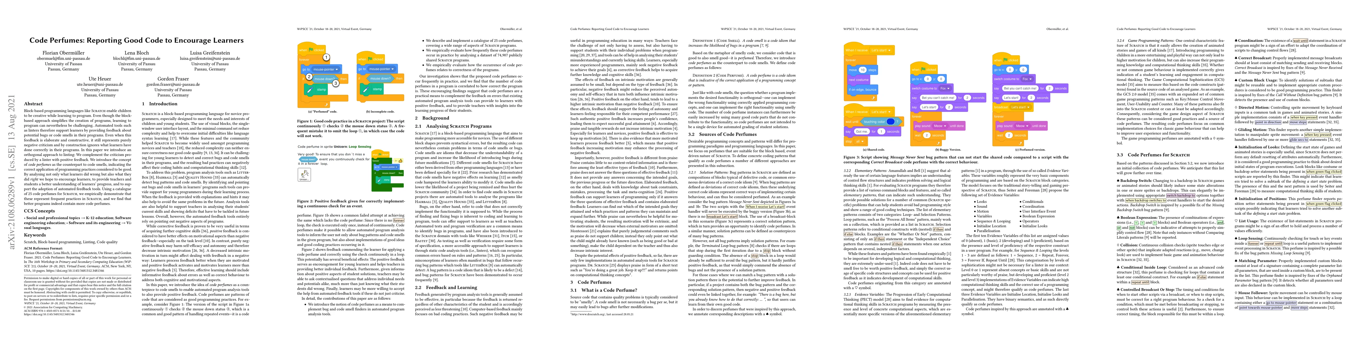 Block-based programming languages like Scratch enable children to be creative while learning to program. Even though the block-based approach simplifies the creation of programs, learning to program can nevertheless be challenging. Automated tools such as linters therefore support learners by providing feedback about potential bugs or code smells in their programs. Even when this feedback is elaborate and constructive, it still represents purely negative criticism and by construction ignores what learners have done correctly in their programs. In this paper we introduce an orthogonal approach to linting: We complement the criticism produced by a linter with positive feedback. We introduce the concept of code perfumes as the counterpart to code smells, indicating the correct application of programming practices considered to be good. By analysing not only what learners did wrong but also what they did right we hope to encourage learners, to provide teachers and students a better understanding of learners' progress, and to support the adoption of automated feedback tools. Using a catalogue of 25 code perfumes for Scratch, we empirically demonstrate that these represent frequent practices in Scratch, and we find that better programs indeed contain more code perfumes.