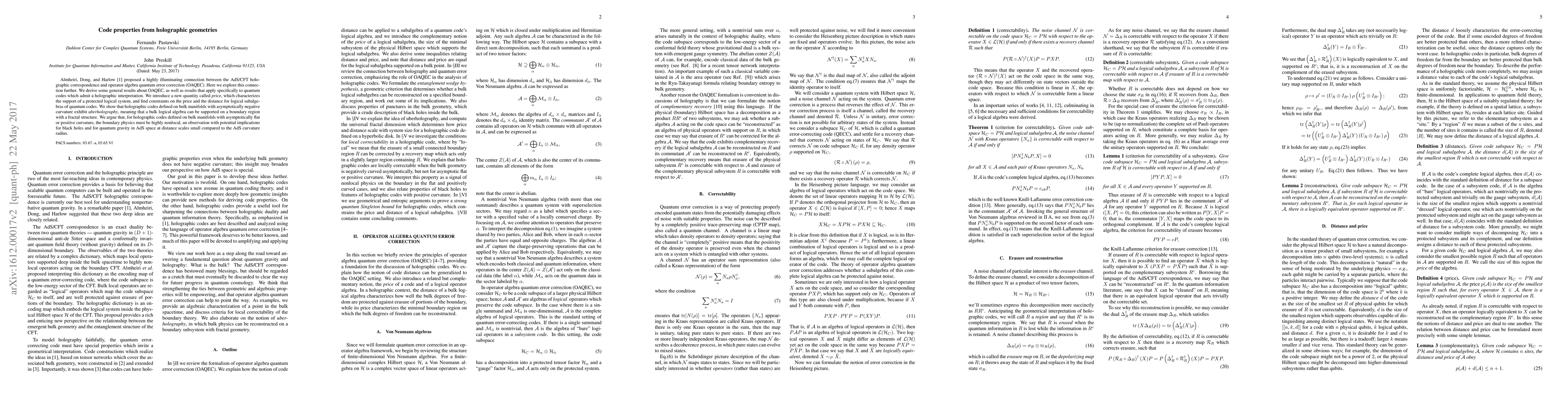 Almheiri, Dong, and Harlow [arXiv:1411.7041] proposed a highly illuminating connection between the AdS/CFT holographic correspondence and operator algebra quantum error correction (OAQEC). Here we explore this connection further. We derive some general results about OAQEC, as well as results that apply specifically to quantum codes which admit a holographic interpretation. We introduce a new quantity called `price', which characterizes the support of a protected logical system, and find constraints on the price and the distance for logical subalgebras of quantum codes. We show that holographic codes defined on bulk manifolds with asymptotically negative curvature exhibit `uberholography', meaning that a bulk logical algebra can be supported on a boundary region with a fractal structure. We argue that, for holographic codes defined on bulk manifolds with asymptotically flat or positive curvature, the boundary physics must be highly nonlocal, an observation with potential implications for black holes and for quantum gravity in AdS space at distance scales small compared to the AdS curvature radius.