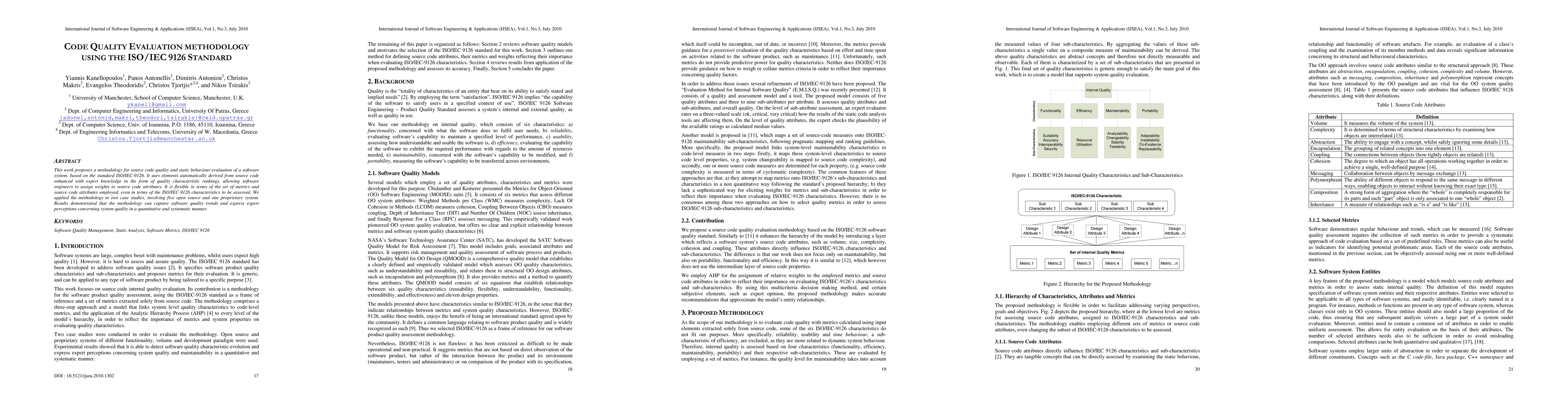 A proposed methodology uses ISO/IEC 9126 to evaluate software quality, capturing trends and expert perceptions in a quantitative and systematic way. It allows for flexibility in metrics and attribute selection, demonstrating effective application through two case studies.