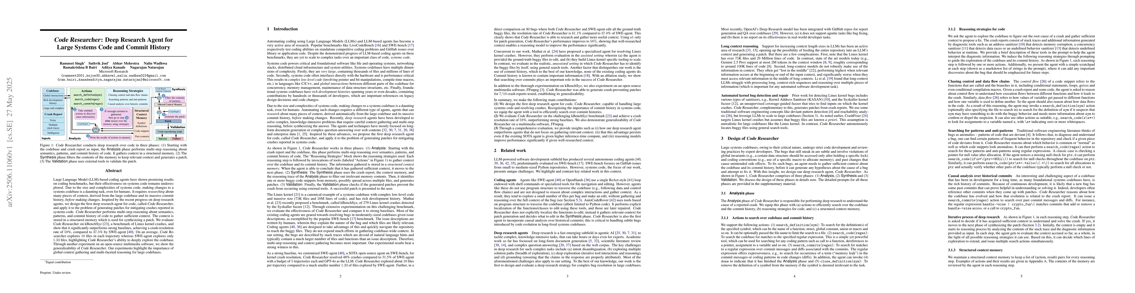 Large Language Model (LLM)-based coding agents have shown promising results on coding benchmarks, but their effectiveness on systems code remains underexplored. Due to the size and complexities of systems code, making changes to a systems codebase is a daunting task, even for humans. It requires researching about many pieces of context, derived from the large codebase and its massive commit history, before making changes. Inspired by the recent progress on deep research agents, we design the first deep research agent for code, called Code Researcher, and apply it to the problem of generating patches for mitigating crashes reported in systems code. Code Researcher performs multi-step reasoning about semantics, patterns, and commit history of code to gather sufficient context. The context is stored in a structured memory which is used for synthesizing a patch. We evaluate Code Researcher on kBenchSyz, a benchmark of Linux kernel crashes, and show that it significantly outperforms strong baselines, achieving a crash-resolution rate of 58%, compared to 37.5% by SWE-agent. On an average, Code Researcher explores 10 files in each trajectory whereas SWE-agent explores only 1.33 files, highlighting Code Researcher's ability to deeply explore the codebase. Through another experiment on an open-source multimedia software, we show the generalizability of Code Researcher. Our experiments highlight the importance of global context gathering and multi-faceted reasoning for large codebases.