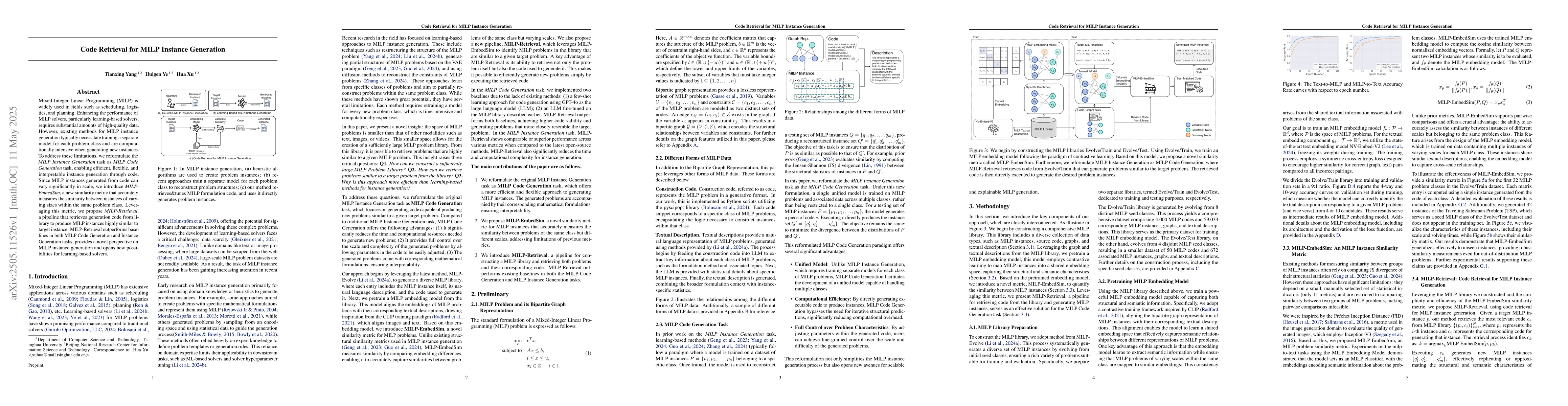 The paper reformulates MILP Instance Generation as MILP Code Generation, introducing MILP-EmbedSim for similarity measurement between instances of varying sizes. It proposes MILP-Retrieval to efficiently generate MILP instances similar to a target instance using code from a library.