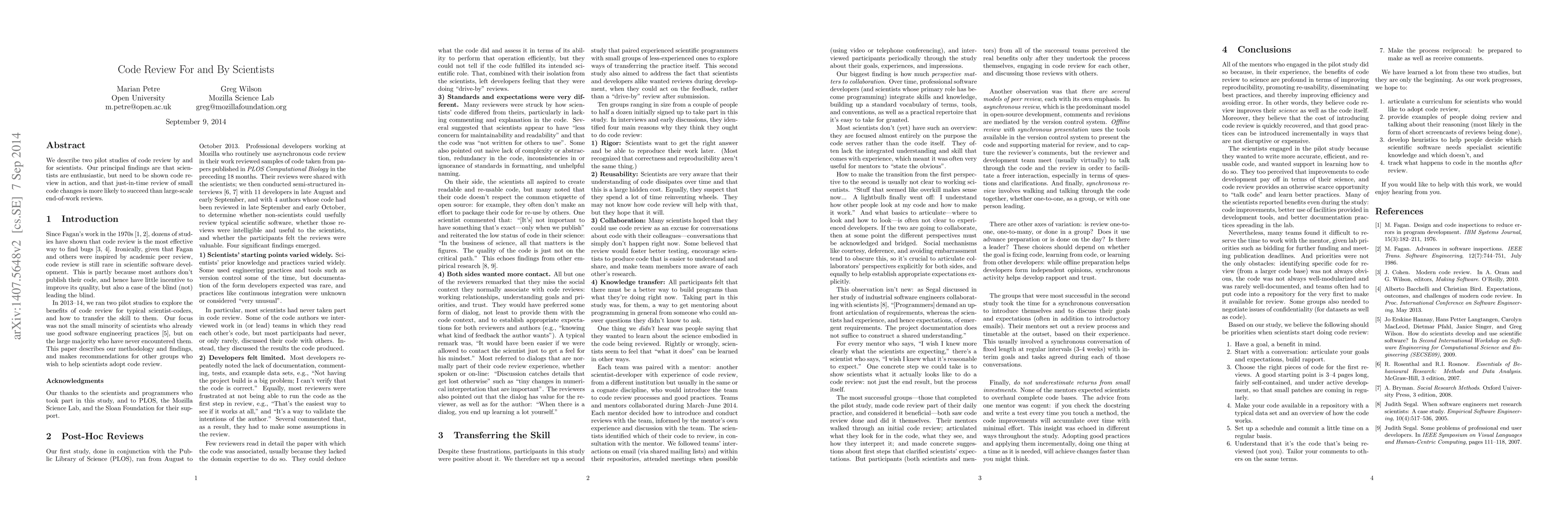 We describe two pilot studies of code review by and for scientists. Our principal findings are that scientists are enthusiastic, but need to be shown code review in action, and that just-in-time review of small code changes is more likely to succeed than large-scale end-of-work reviews.