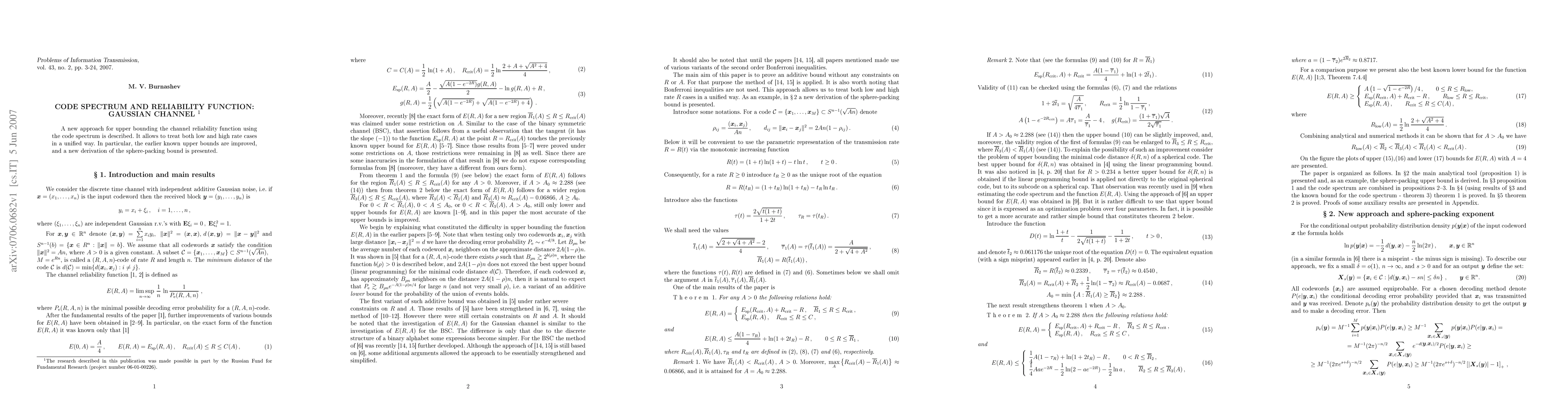 A new approach bounds channel reliability function using code spectrum, improving earlier bounds and deriving a new sphere-packing bound for both low and high rate cases.