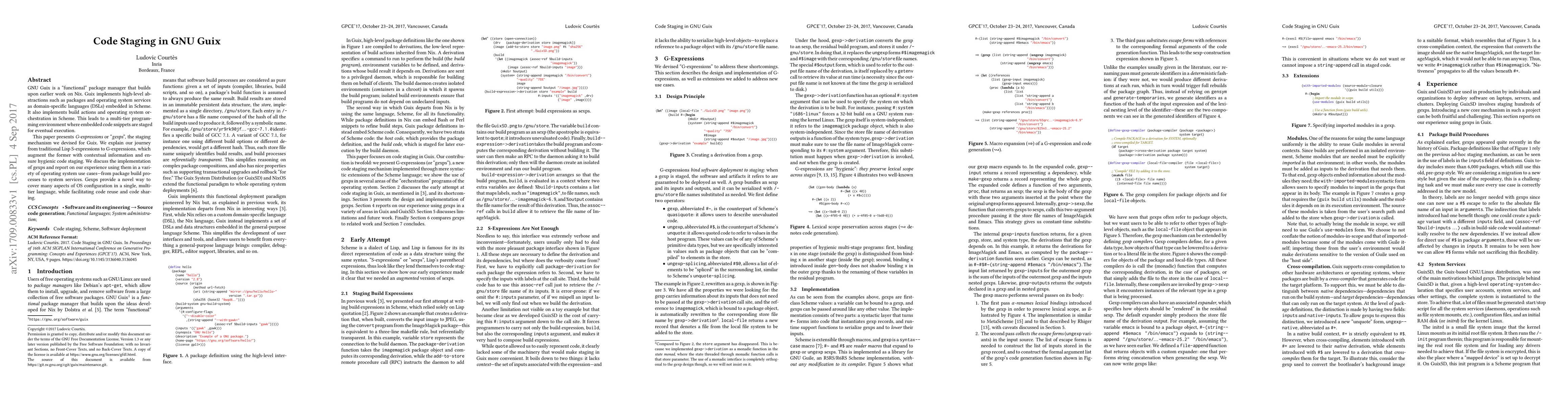 GNU Guix is a " functional " package manager that builds upon earlier work on Nix. Guix implements high-level abstractions such as packages and operating system services as domain-specic languages (DSLs) embedded in Scheme. It also implements build actions and operating system orchestration in Scheme. This leads to a multi-tier programming environment where embedded code snippets are staged for eventual execution. This paper presents G-expressions or " gexps ", the staging mechanism we devised for Guix. We explain our journey from traditional Lisp S-expressions to G-expressions, which augment the former with contextual information and ensure hygienic code staging. We discuss the implementation of gexps and report on our experience using them in a variety of operating system use cases-from package build processes to system services. Gexps provide a novel way to cover many aspects of OS connguration in a single, multi-tier language, while facilitating code reuse and code sharing .