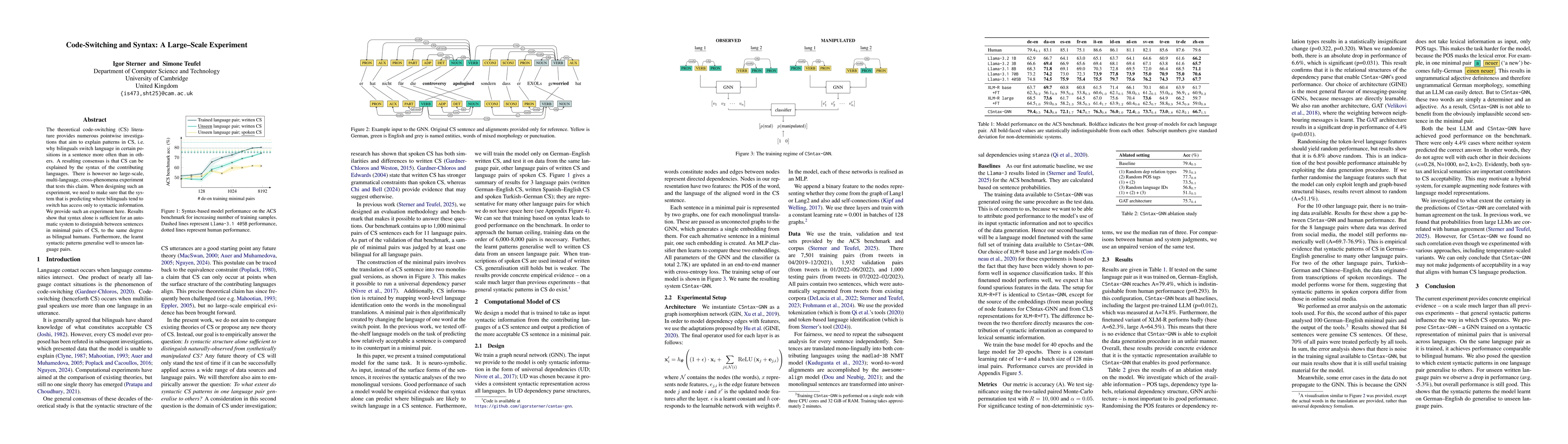 A large-scale experiment found that syntax alone can distinguish between bilingual sentences with minimal code-switching, matching human performance levels. Syntax patterns learned from the data generalize well to unseen language pairs.