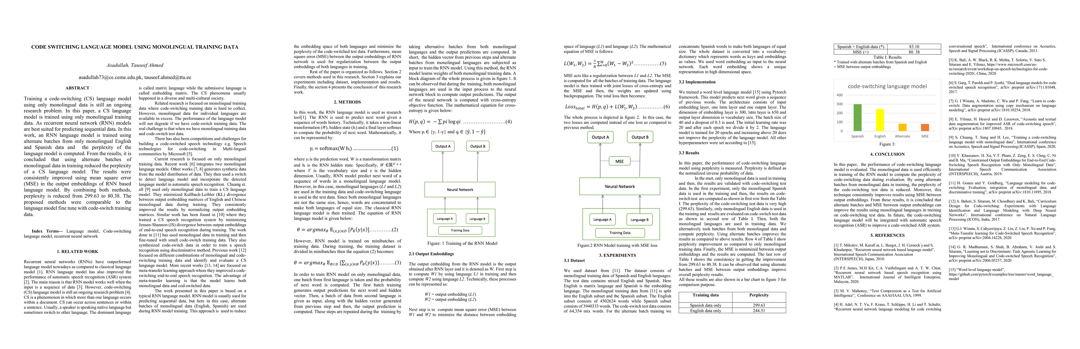 Training a code-switching (CS) language model using only monolingual data is still an ongoing research problem. In this paper, a CS language model is trained using only monolingual training data. As recurrent neural network (RNN) models are best suited for predicting sequential data. In this work, an RNN language model is trained using alternate batches from only monolingual English and Spanish data and the perplexity of the language model is computed. From the results, it is concluded that using alternate batches of monolingual data in training reduced the perplexity of a CS language model. The results were consistently improved using mean square error (MSE) in the output embeddings of RNN based language model. By combining both methods, perplexity is reduced from 299.63 to 80.38. The proposed methods were comparable to the language model fine tune with code-switch training data.