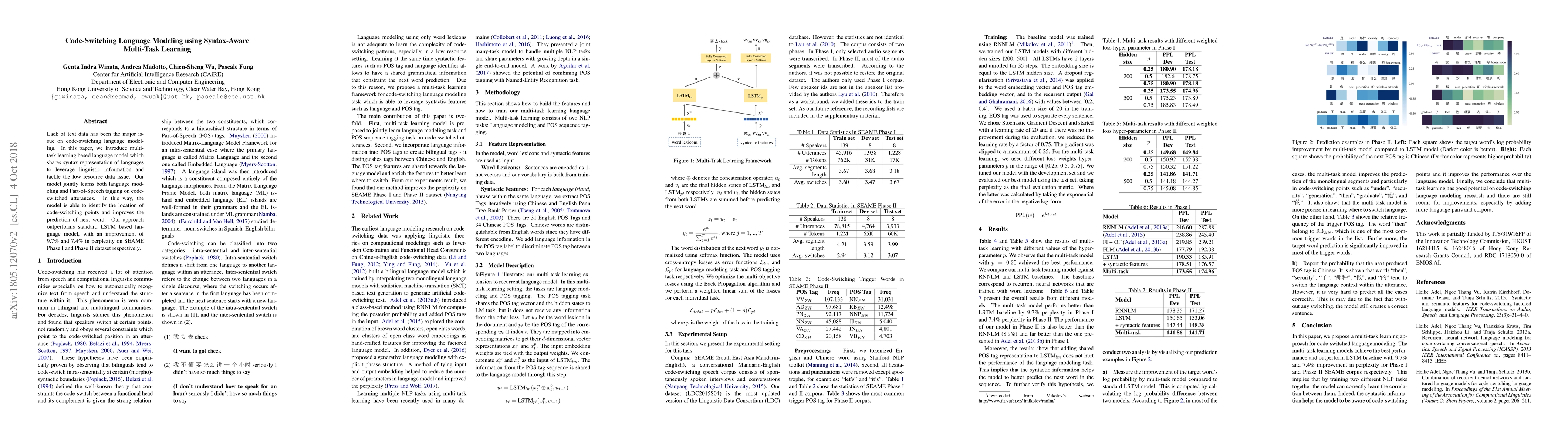 This paper proposes a multi-task learning language model to address the scarcity of data in code-switching language modeling. By sharing syntax representations and jointly learning language modeling and Part-of-Speech tagging, the model identifies code-switching points and enhances next-word prediction, outperforming standard LSTM models by 9.7% and 7.4% in perplexity on SEAME datasets.