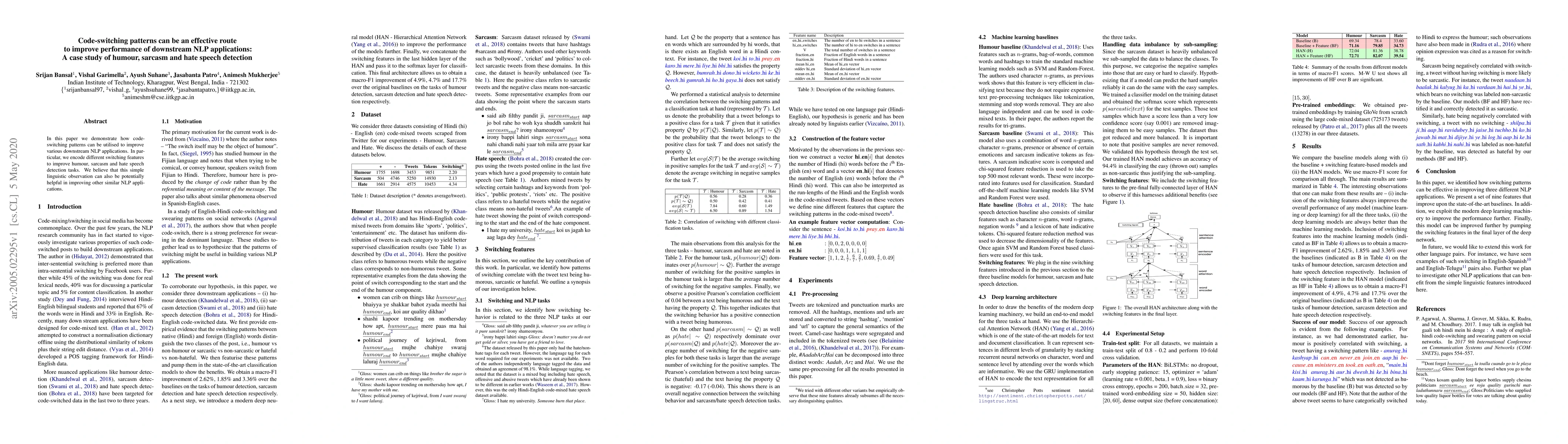 In this paper we demonstrate how code-switching patterns can be utilised to improve various downstream NLP applications. In particular, we encode different switching features to improve humour, sarcasm and hate speech detection tasks. We believe that this simple linguistic observation can also be potentially helpful in improving other similar NLP applications.
