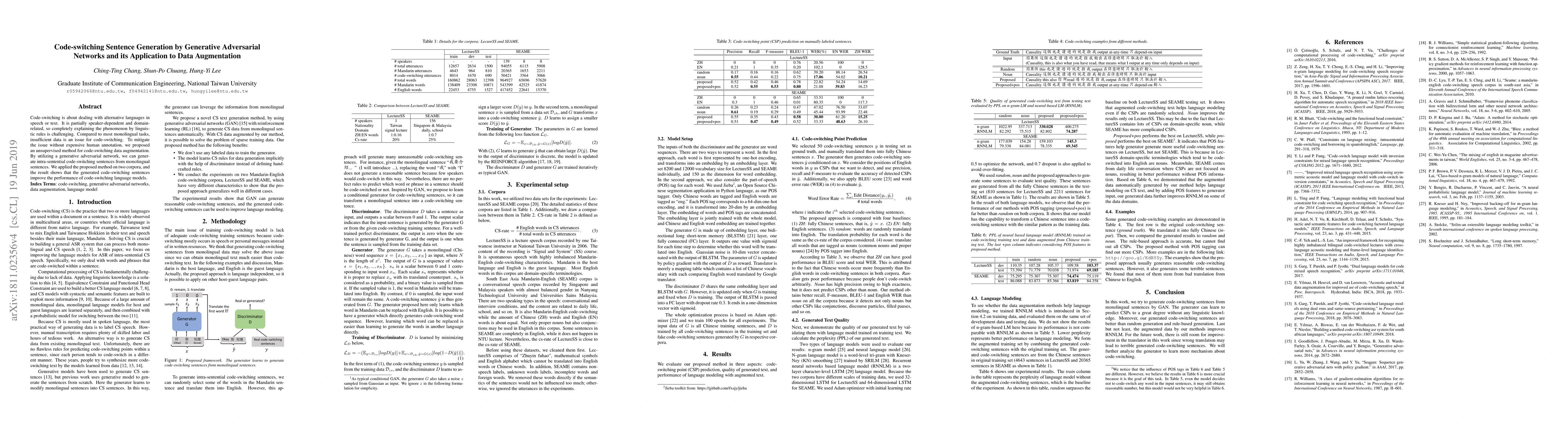 Code-switching is about dealing with alternative languages in speech or text. It is partially speaker-depend and domain-related, so completely explaining the phenomenon by linguistic rules is challenging. Compared to most monolingual tasks, insufficient data is an issue for code-switching. To mitigate the issue without expensive human annotation, we proposed an unsupervised method for code-switching data augmentation. By utilizing a generative adversarial network, we can generate intra-sentential code-switching sentences from monolingual sentences. We applied proposed method on two corpora, and the result shows that the generated code-switching sentences improve the performance of code-switching language models.