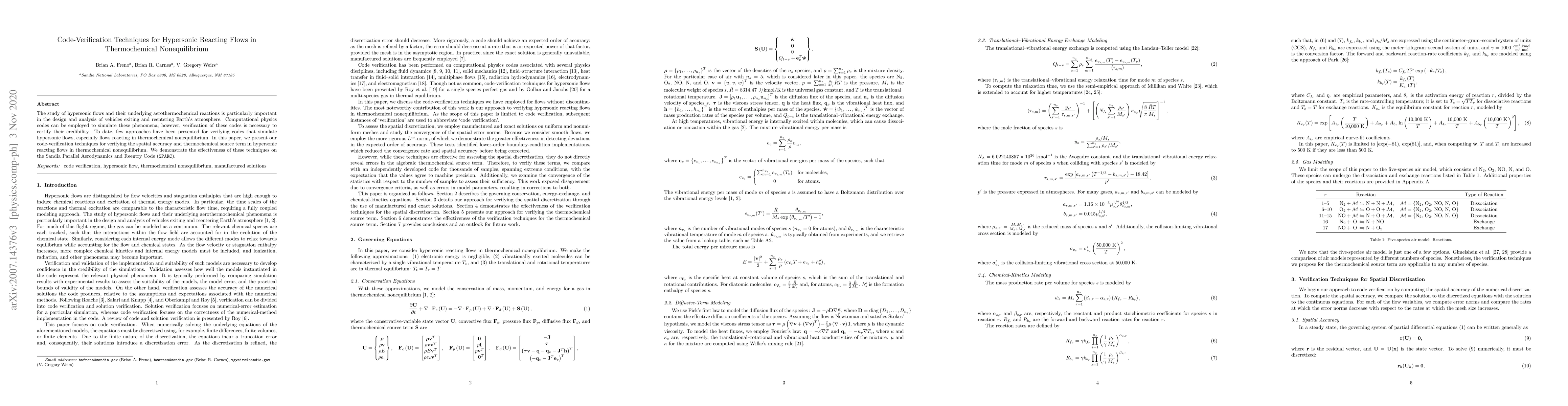 The study presents code-verification techniques for hypersonic reacting flows in thermochemical nonequilibrium using manufactured and exact solutions with L∞-norm and L1-norm. An independent code was developed to assess the algebraic thermochemical source term, querying it multiple times to study convergence properties.