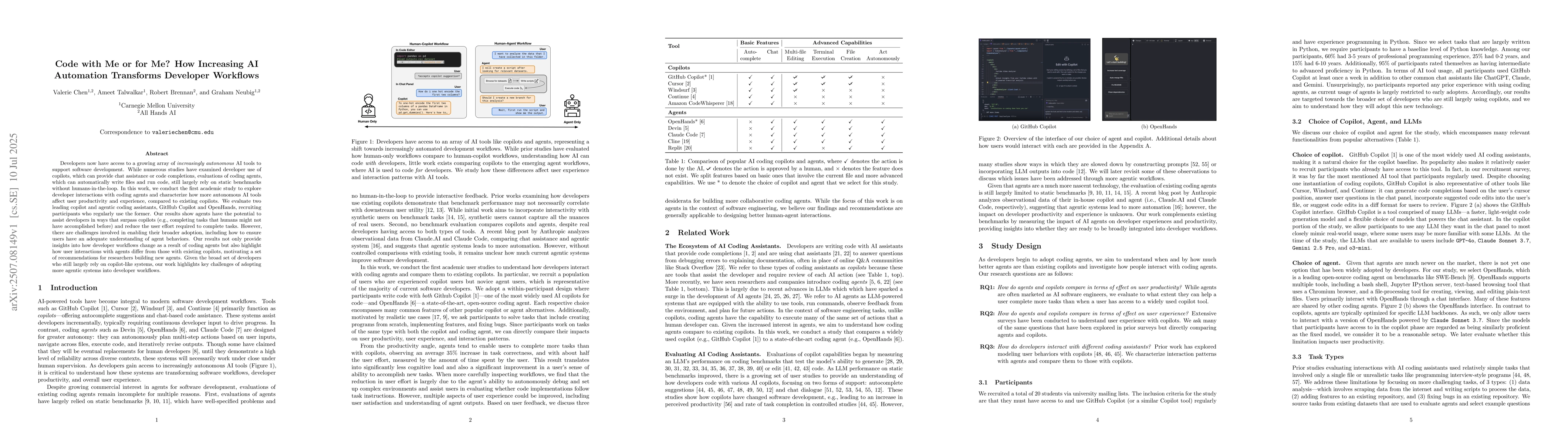 Developers now have access to a growing array of increasingly autonomous AI tools to support software development. While numerous studies have examined developer use of copilots, which can provide chat assistance or code completions, evaluations of coding agents, which can automatically write files and run code, still largely rely on static benchmarks without humans-in-the-loop. In this work, we conduct the first academic study to explore developer interactions with coding agents and characterize how more autonomous AI tools affect user productivity and experience, compared to existing copilots. We evaluate two leading copilot and agentic coding assistants, GitHub Copilot and OpenHands, recruiting participants who regularly use the former. Our results show agents have the potential to assist developers in ways that surpass copilots (e.g., completing tasks that humans might not have accomplished before) and reduce the user effort required to complete tasks. However, there are challenges involved in enabling their broader adoption, including how to ensure users have an adequate understanding of agent behaviors. Our results not only provide insights into how developer workflows change as a result of coding agents but also highlight how user interactions with agents differ from those with existing copilots, motivating a set of recommendations for researchers building new agents. Given the broad set of developers who still largely rely on copilot-like systems, our work highlights key challenges of adopting more agentic systems into developer workflows.