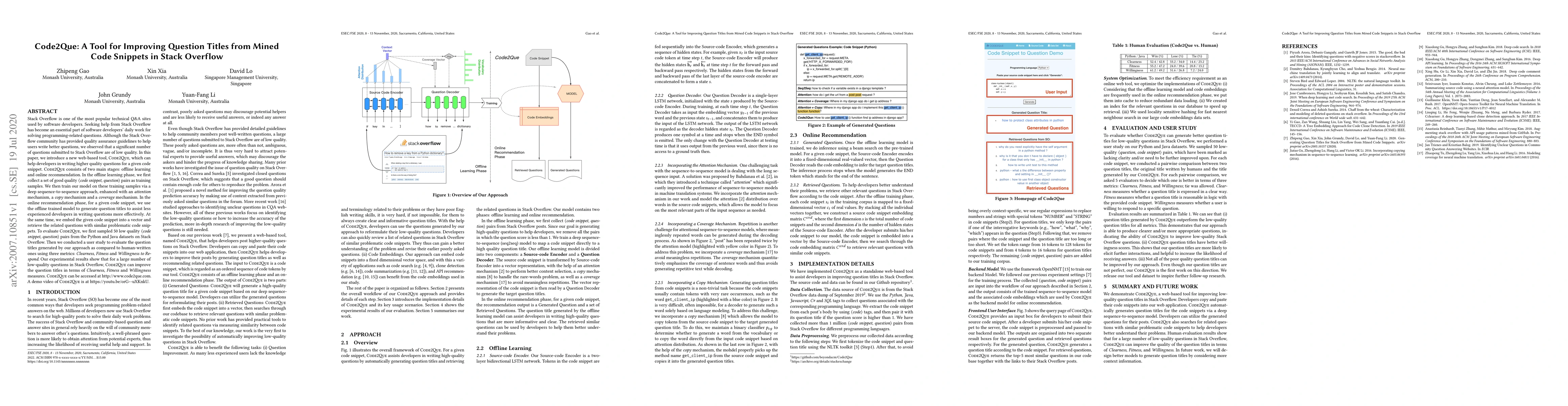 paper, we introduce a new web-based tool, Code2Que, which can help developers