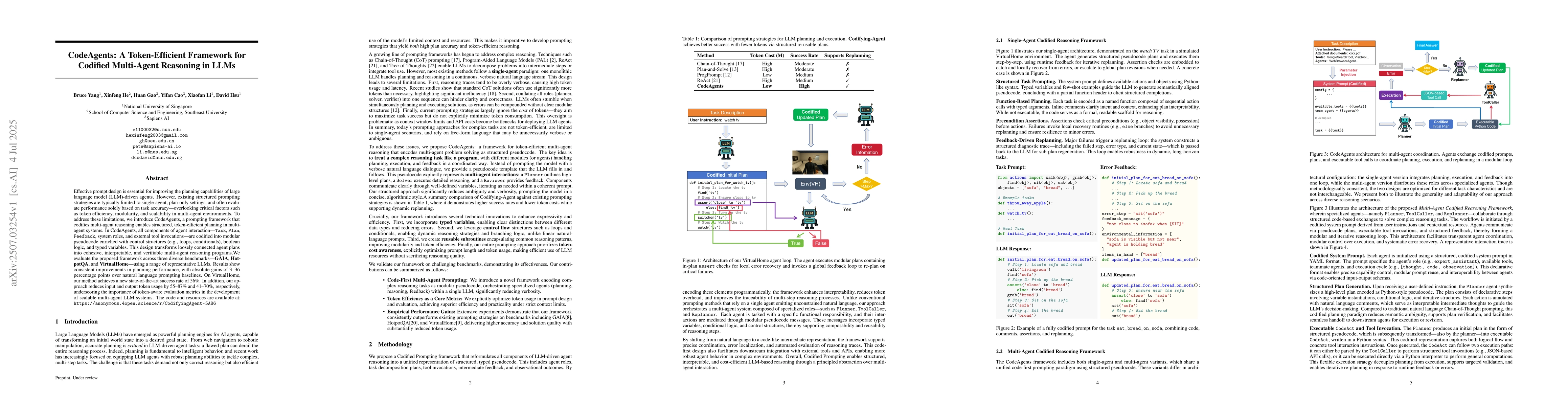Effective prompt design is essential for improving the planning capabilities of large language model (LLM)-driven agents. However, existing structured prompting strategies are typically limited to single-agent, plan-only settings, and often evaluate performance solely based on task accuracy - overlooking critical factors such as token efficiency, modularity, and scalability in multi-agent environments. To address these limitations, we introduce CodeAgents, a prompting framework that codifies multi-agent reasoning and enables structured, token-efficient planning in multi-agent systems. In CodeAgents, all components of agent interaction - Task, Plan, Feedback, system roles, and external tool invocations - are codified into modular pseudocode enriched with control structures (e.g., loops, conditionals), boolean logic, and typed variables. This design transforms loosely connected agent plans into cohesive, interpretable, and verifiable multi-agent reasoning programs. We evaluate the proposed framework across three diverse benchmarks - GAIA, HotpotQA, and VirtualHome - using a range of representative LLMs. Results show consistent improvements in planning performance, with absolute gains of 3-36 percentage points over natural language prompting baselines. On VirtualHome, our method achieves a new state-of-the-art success rate of 56%. In addition, our approach reduces input and output token usage by 55-87% and 41-70%, respectively, underscoring the importance of token-aware evaluation metrics in the development of scalable multi-agent LLM systems. The code and resources are available at: https://anonymous.4open.science/r/CodifyingAgent-5A86
