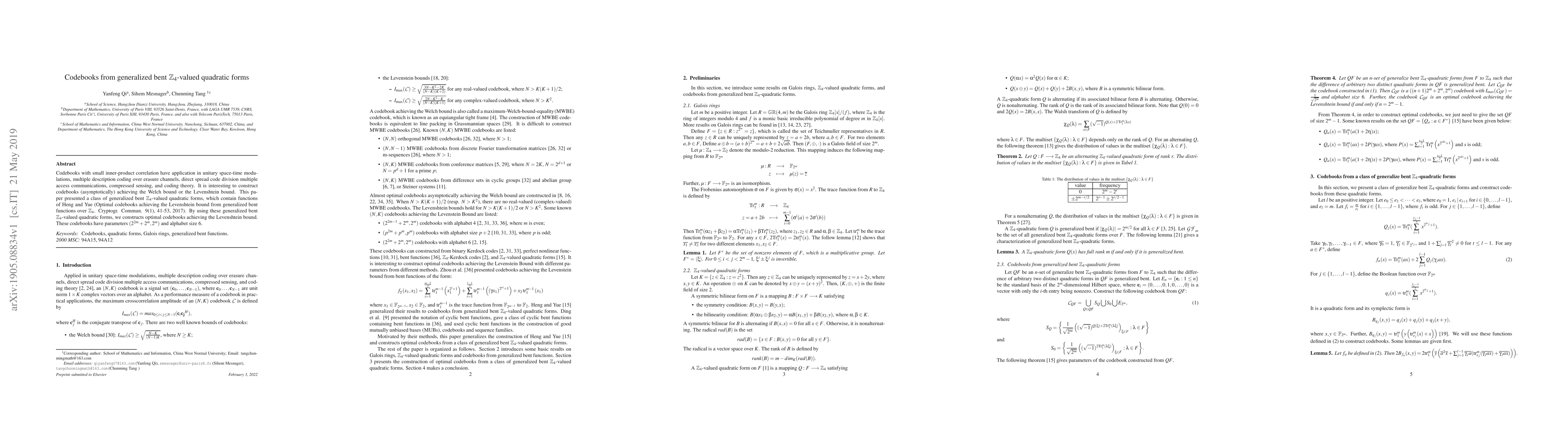 Codebooks with small inner-product correlation have application in unitary space-time modulations, multiple description coding over erasure channels, direct spread code division multiple access communications, compressed sensing, and coding theory. It is interesting to construct codebooks (asymptotically) achieving the Welch bound or the Levenshtein bound. This paper presented a class of generalized bent $\mathbb{Z}_4$-valued quadratic forms, which contain functions of Heng and Yue (Optimal codebooks achieving the Levenshtein bound from generalized bent functions over $\mathbb{Z}_4$. Cryptogr. Commun. 9(1), 41-53, 2017). By using these generalized bent $\mathbb{Z}_4$-valued quadratic forms, we constructs optimal codebooks achieving the Levenshtein bound. These codebooks have parameters $(2^{2m}+2^m,2^m)$ and alphabet size $6$.