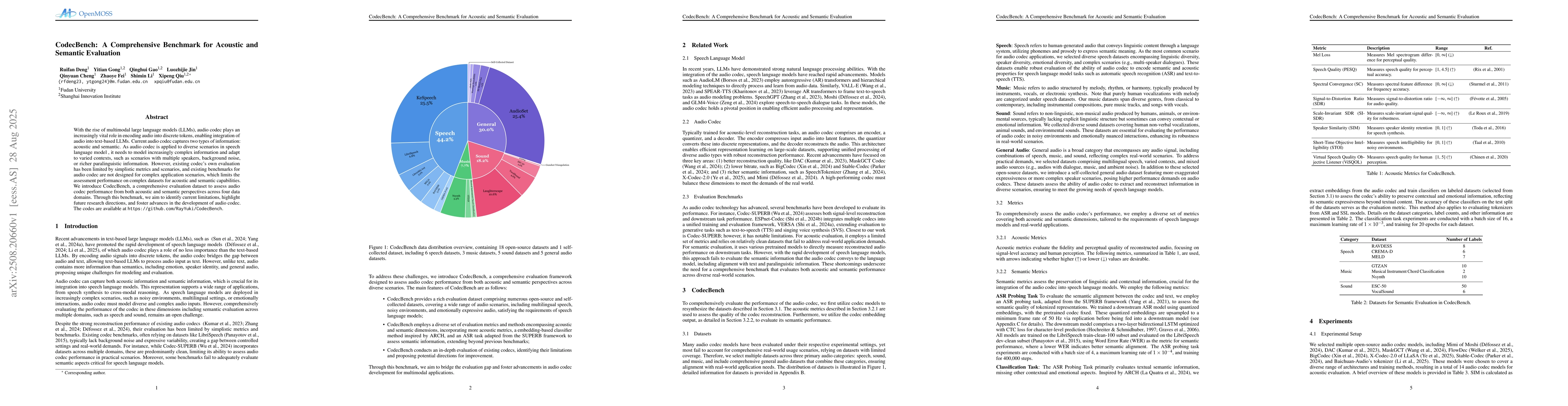 With the rise of multimodal large language models (LLMs), audio codec plays an increasingly vital role in encoding audio into discrete tokens, enabling integration of audio into text-based LLMs. Current audio codec captures two types of information: acoustic and semantic. As audio codec is applied to diverse scenarios in speech language model , it needs to model increasingly complex information and adapt to varied contexts, such as scenarios with multiple speakers, background noise, or richer paralinguistic information. However, existing codec's own evaluation has been limited by simplistic metrics and scenarios, and existing benchmarks for audio codec are not designed for complex application scenarios, which limits the assessment performance on complex datasets for acoustic and semantic capabilities. We introduce CodecBench, a comprehensive evaluation dataset to assess audio codec performance from both acoustic and semantic perspectives across four data domains. Through this benchmark, we aim to identify current limitations, highlight future research directions, and foster advances in the development of audio codec. The codes are available at https://github.com/RayYuki/CodecBench.