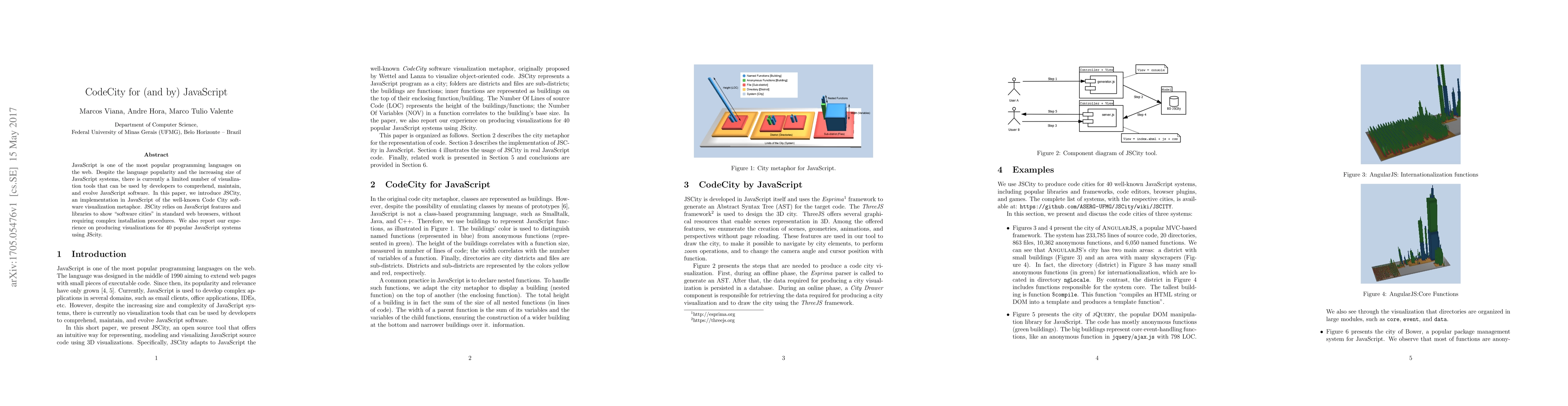 This paper introduces JSCity, a JavaScript-based visualization tool inspired by the Code City metaphor, designed to help developers understand and maintain large JavaScript systems. The tool leverages JavaScript features to run in standard web browsers without complex installations, and the authors demonstrate its application to 40 popular JavaScript projects.