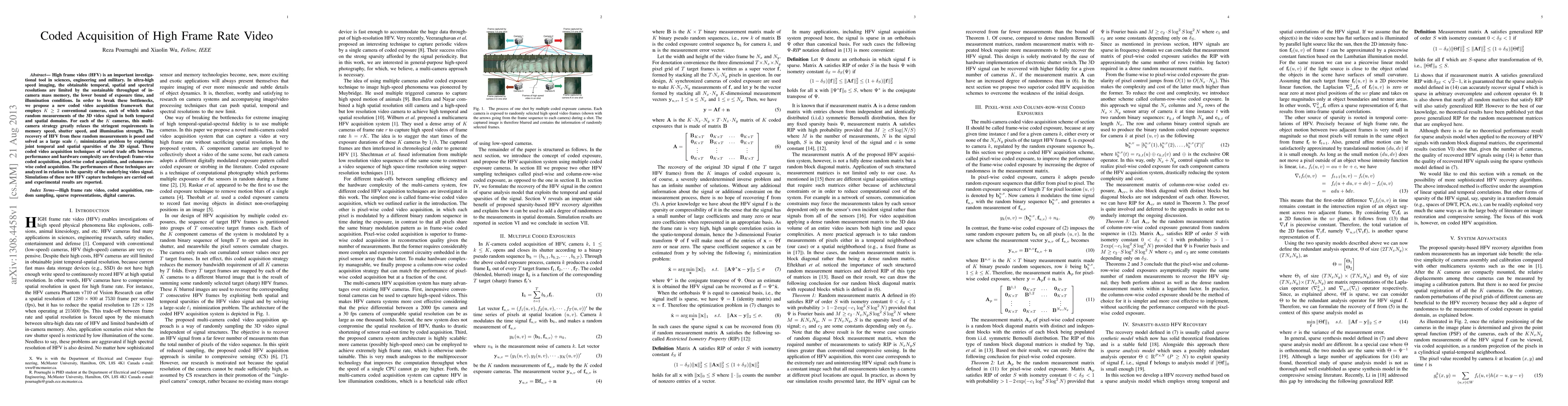 This paper proposes a new framework for acquiring high frame rate video (HFV) using multiple conventional cameras to overcome limitations in memory speed, shutter speed, and illumination. It introduces three coded acquisition techniques—frame-wise, pixel-wise, and column-row-wise—that leverage joint temporal and spatial sparsities to reconstruct HFV from random measurements, and reports simulation and experimental results.