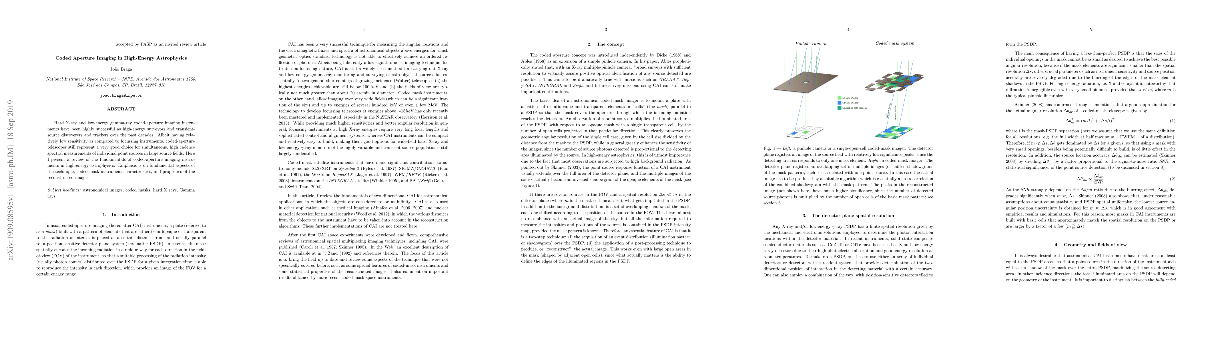 This paper reviews the fundamentals of coded-aperture imaging instruments used in high-energy astrophysics, highlighting their role in surveying and tracking hard X-ray and low-energy gamma-ray sources despite lower sensitivity compared to focusing instruments. It focuses on the technique's characteristics and the quality of reconstructed images.