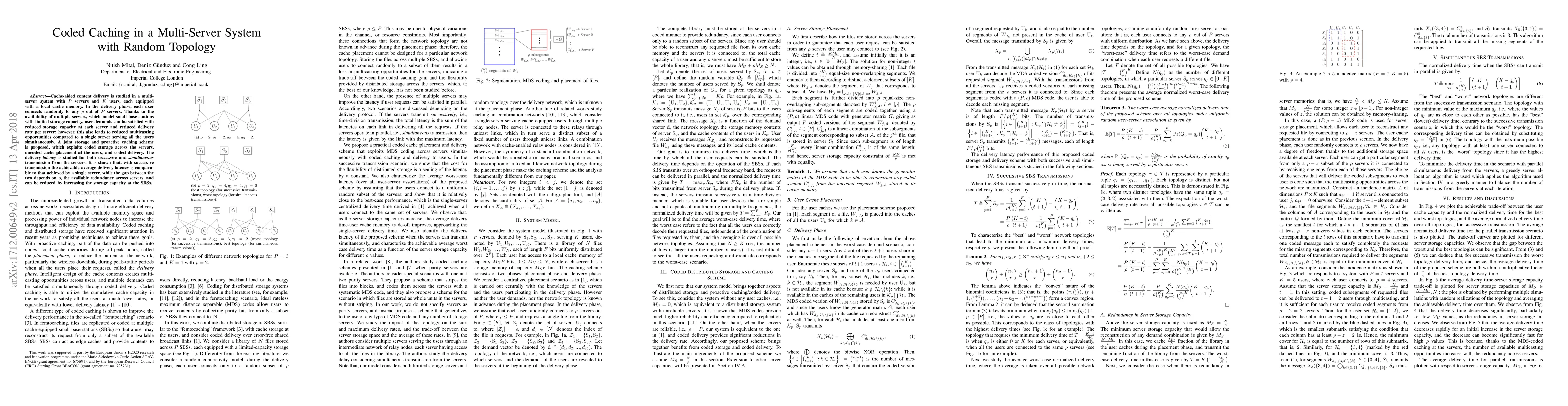 This paper proposes a joint storage and caching scheme for a multi-server system with random topology, aiming to reduce storage and delivery rates. It shows that successive transmission can achieve latency comparable to a single server, with the gap depending on server redundancy and cache size.