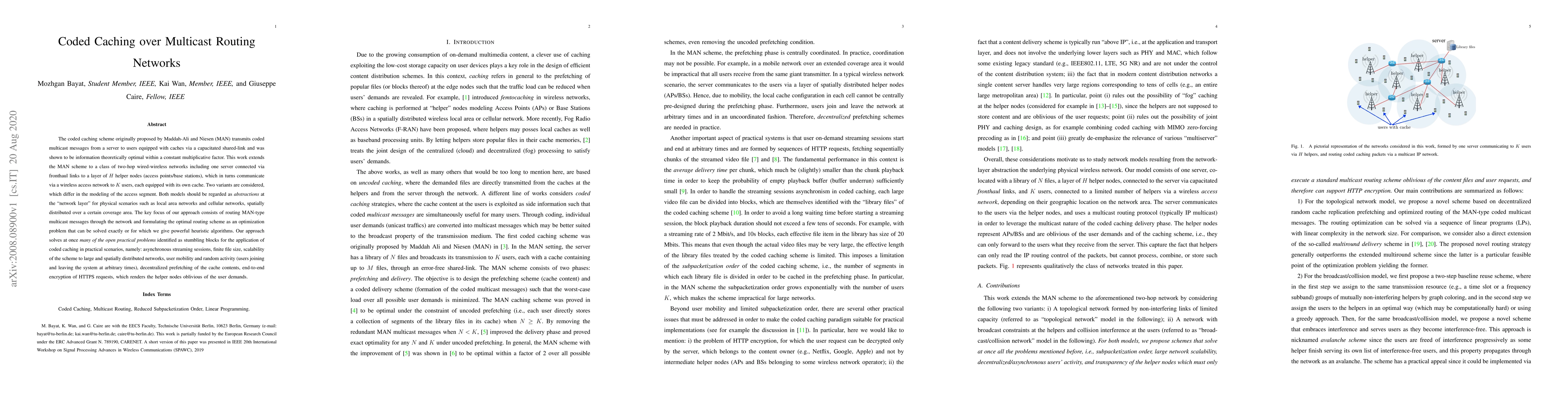 The coded caching scheme originally proposed by Maddah-Ali and Niesen (MAN) transmits coded multicast messages from a server to users equipped with caches via a capacitated shared-link and was shown to be information theoretically optimal within a constant multiplicative factor. This work extends the MAN scheme to a class of two-hop wired-wireless networks including one server connected via fronthaul links to a layer of $H$ helper nodes (access points/base stations), which in turns communicate via a wireless access network to $K$ users, each equipped with its own cache. Two variants are considered, which differ in the modeling of the access segment. Both models should be regarded as abstractions at the network layer for physical scenarios such as local area networks and cellular networks, spatially distributed over a certain coverage area. The key focus of our approach consists of routing MAN-type multicast messages through the network and formulating the optimal routing scheme as an optimization problem that can be solved exactly or for which we give powerful heuristic algorithms. Our approach solves at once many of the open practical problems identified as stumbling blocks for the application of coded caching in practical scenarios, namely: asynchronous streaming sessions, finite file size, scalability of the scheme to large and spatially distributed networks, user mobility and random activity (users joining and leaving the system at arbitrary times), decentralized prefetching of the cache contents, end-to-end encryption of HTTPS requests, which renders the helper nodes oblivious of the user demands.