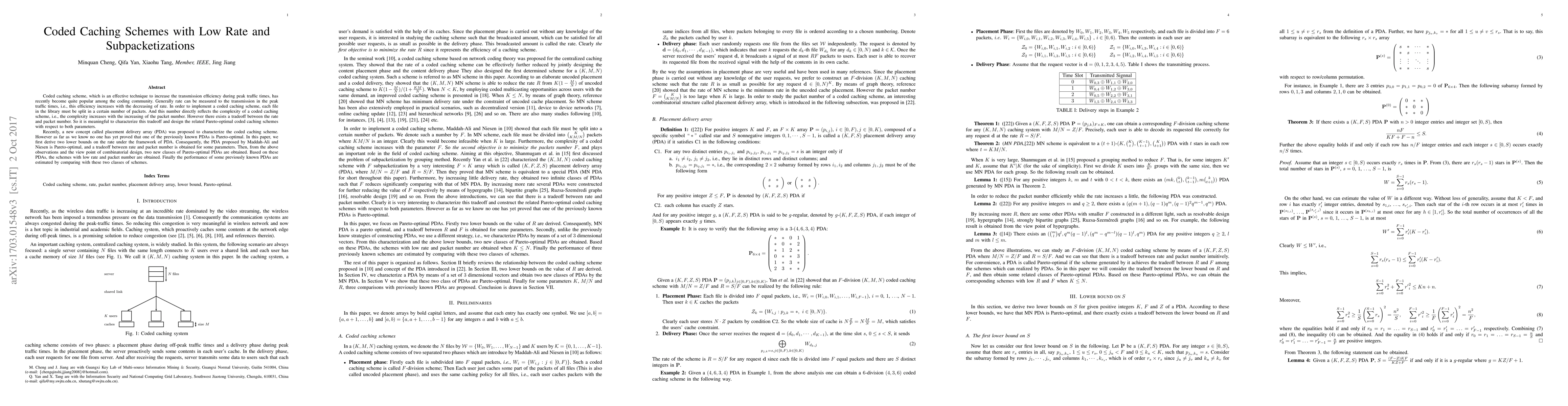 Coded caching scheme, which is an effective technique to increase the transmission efficiency during peak traffic times, has recently become quite popular among the coding community. Generally rate can be measured to the transmission in the peak traffic times, i.e., this efficiency increases with the decreasing of rate. In order to implement a coded caching scheme, each file in the library must be split in a certain number of packets. And this number directly reflects the complexity of a coded caching scheme, i.e., the complexity increases with the increasing of the packet number. However there exists a tradeoff between the rate and packet number. So it is meaningful to characterize this tradeoff and design the related Pareto-optimal coded caching schemes with respect to both parameters. Recently, a new concept called placement delivery array (PDA) was proposed to characterize the coded caching scheme. However as far as we know no one has yet proved that one of the previously known PDAs is Pareto-optimal. In this paper, we first derive two lower bounds on the rate under the framework of PDA. Consequently, the PDA proposed by Maddah-Ali and Niesen is Pareto-optimal, and a tradeoff between rate and packet number is obtained for some parameters. Then, from the above observations and the view point of combinatorial design, two new classes of Pareto-optimal PDAs are obtained. Based on these PDAs, the schemes with low rate and packet number are obtained. Finally the performance of some previously known PDAs are estimated by comparing with these two classes of schemes.