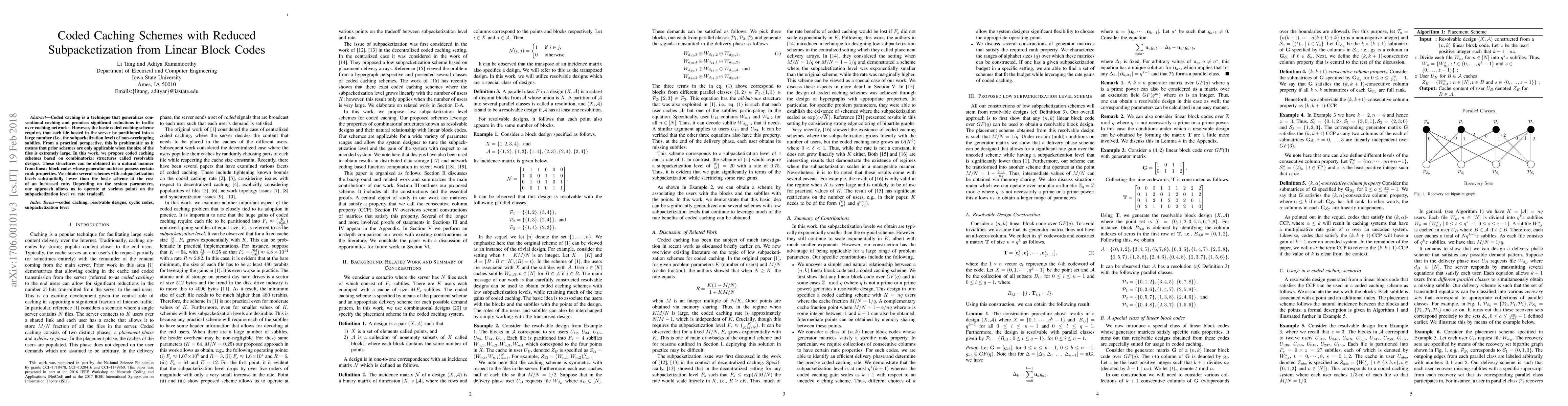 Researchers propose coded caching schemes based on resolvable designs from linear block codes, reducing subpacketization levels while maintaining performance, offering a tradeoff between file size and traffic reduction.