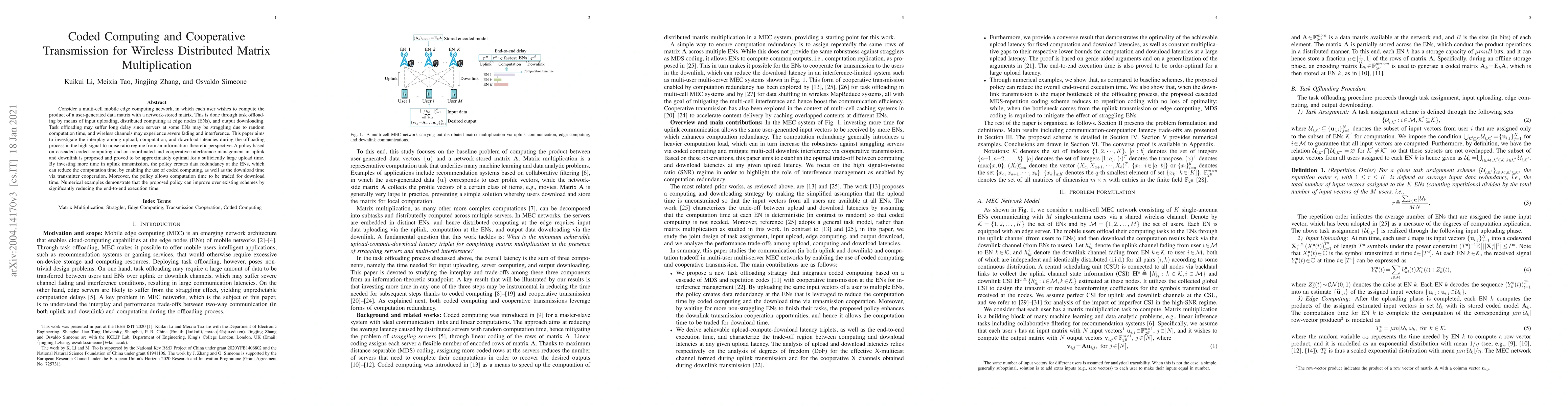This paper proposes a coded computing and cooperative transmission strategy to optimize task offloading in a multi-cell mobile edge computing network for distributed matrix multiplication. The approach leverages data redundancy to reduce computation and download times through coordinated interference management, achieving significant reductions in end-to-end execution time compared to existing methods.