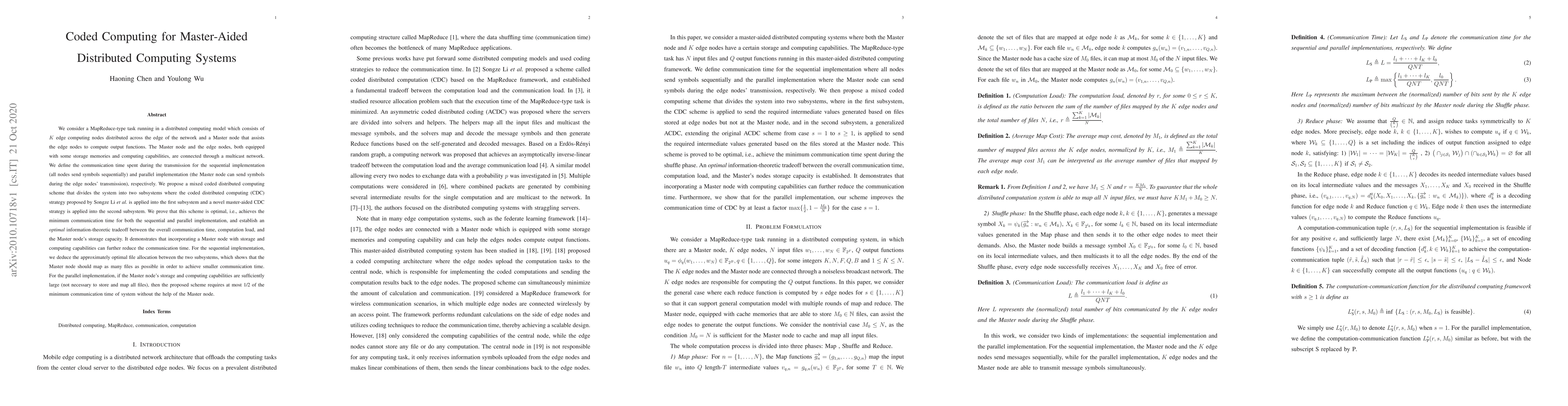 Researchers propose a mixed coded distributed computing scheme that combines two strategies to minimize communication time in master-aided distributed computing systems, achieving optimal tradeoff between computation load, storage capacity, and overall time.