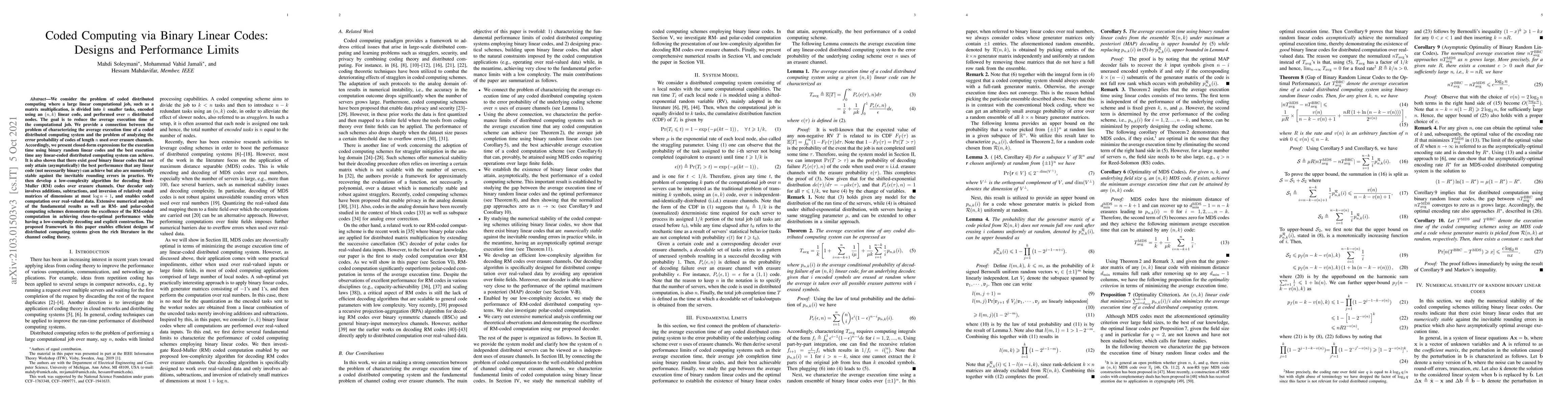 This paper explores coded distributed computing using binary linear codes to reduce execution time for large computational tasks. It establishes connections between execution time and error probability in erasure channels, presenting closed-form expressions for optimal performance and introducing a low-complexity decoder for Reed-Muller codes, demonstrating near-optimal performance with practical stability.