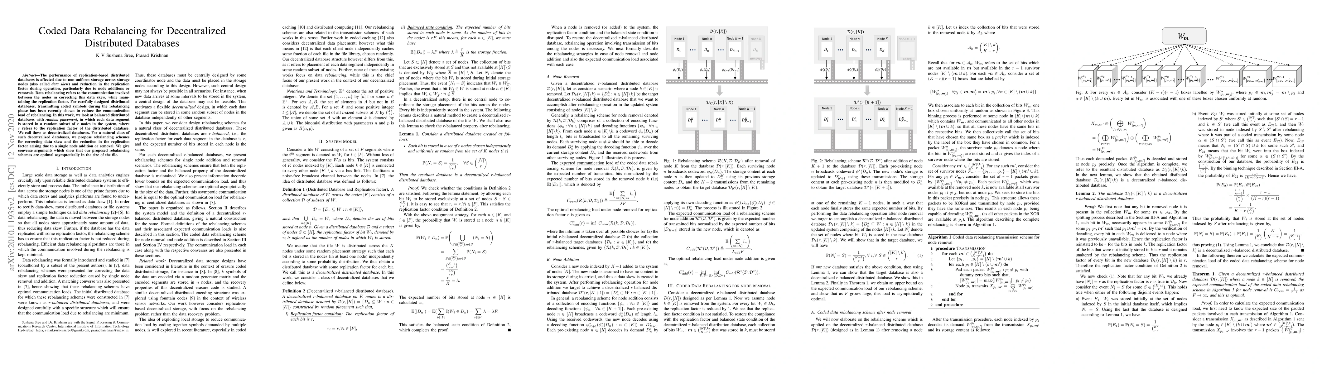 This paper proposes coded data rebalancing schemes for decentralized distributed databases with random placement to correct data skew and replication factor reduction due to node additions or removals. The proposed methods utilize coded symbols to minimize communication load during rebalancing, demonstrating asymptotic optimality in file size.