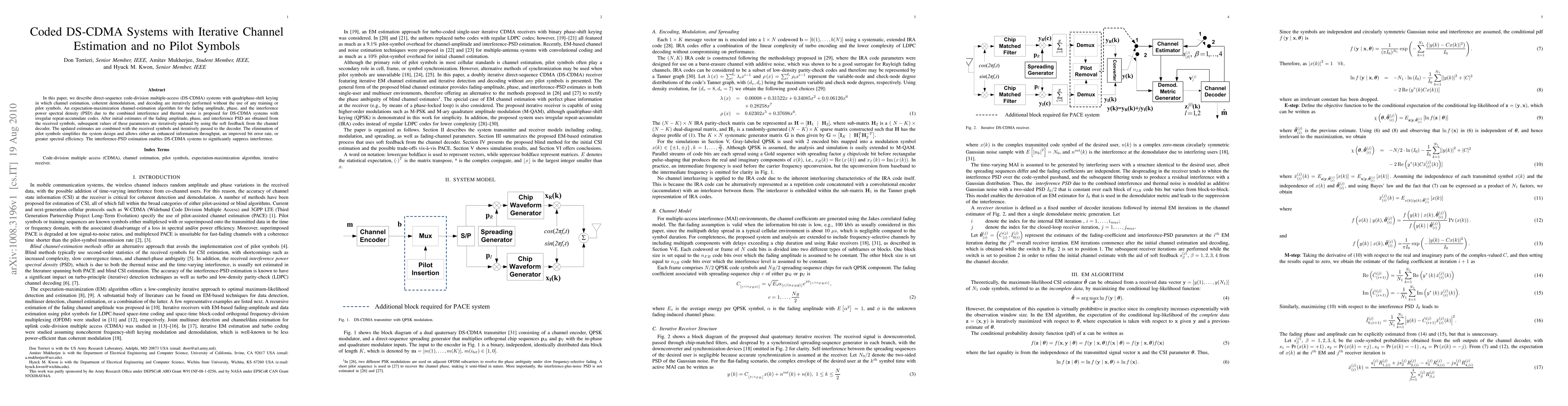 In this paper, we describe direct-sequence code-division multiple-access (DS-CDMA) systems with quadriphase-shift keying in which channel estimation, coherent demodulation, and decoding are iteratively performed without the use of any training or pilot symbols. An expectation-maximization channel-estimation algorithm for the fading amplitude, phase, and the interference power spectral density (PSD) due to the combined interference and thermal noise is proposed for DS-CDMA systems with irregular repeat-accumulate codes. After initial estimates of the fading amplitude, phase, and interference PSD are obtained from the received symbols, subsequent values of these parameters are iteratively updated by using the soft feedback from the channel decoder. The updated estimates are combined with the received symbols and iteratively passed to the decoder. The elimination of pilot symbols simplifies the system design and allows either an enhanced information throughput, an improved bit error rate, or greater spectral efficiency. The interference-PSD estimation enables DS-CDMA systems to significantly suppress interference.