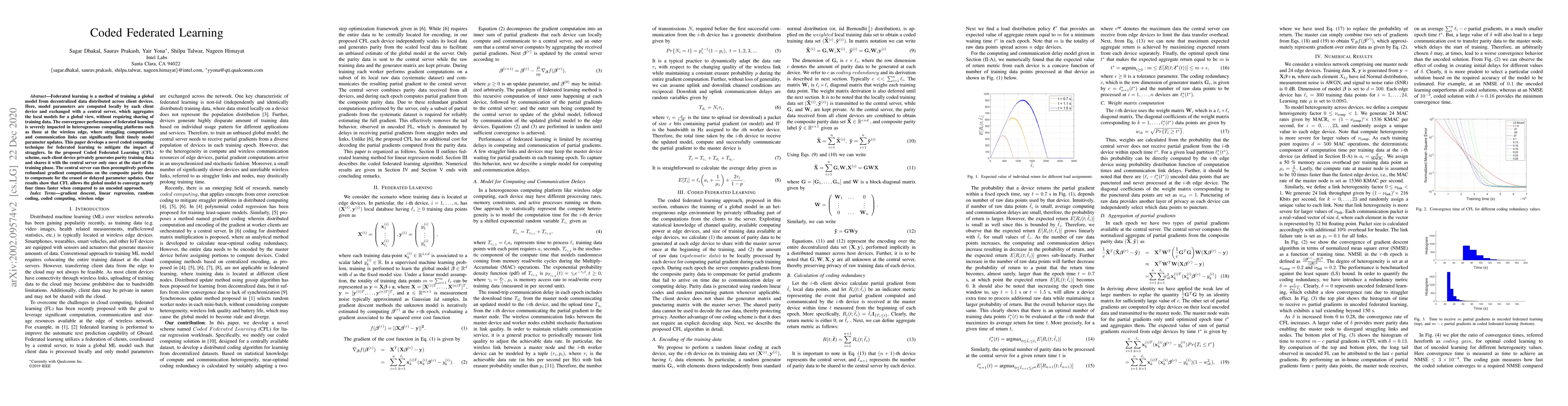 This paper introduces Coded Federated Learning (CFL), a technique that uses coded computing to enhance the convergence of federated learning in heterogeneous environments. By generating parity training data, clients share it once with the server, which performs redundant computations to compensate for stragglers, resulting in nearly four times faster convergence compared to uncoded methods.