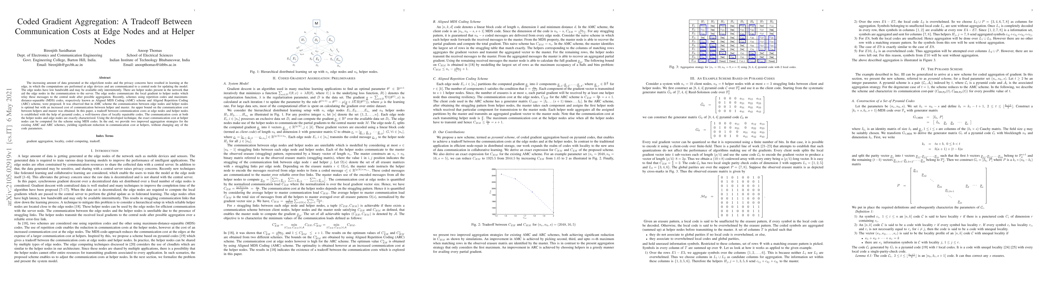 The increasing amount of data generated at the edge/client nodes and the privacy concerns have resulted in learning at the edge, in which the computations are performed at edge devices and are communicated to a central node for updating the model. The edge nodes have low bandwidth and may be available only intermittently. There are helper nodes present in the network that aid the edge nodes in the communication to the server. The edge nodes communicate the local gradient to helper nodes which relay these messages to the central node after possible aggregation. Recently, schemes using repetition codes and maximum-distance-separable (MDS) codes, respectively known as Aligned MDS Coding (AMC) scheme and Aligend Repetition Coding (ARC) scheme, were proposed. It was observed that in AMC scheme the communication between edge nodes and helper nodes is optimal but with an increased cost of communication between helper and master. An upper bound on the communication cost between helpers and master was obtained. In this paper, a tradeoff between communication costs at edge nodes and helper nodes is established with the help of pyramid codes, a well-known class of locally repairable codes. The communication costs at both the helper nodes and edge nodes are exactly characterized. Using the developed technique, the exact communication cost at helper nodes can be computed for the scheme using MDS codes. In the end, we provide two improved aggregation strategies for the existing AMC and ARC schemes, yielding significant reduction in communication cost at helpers, without changing any of the code parameters.