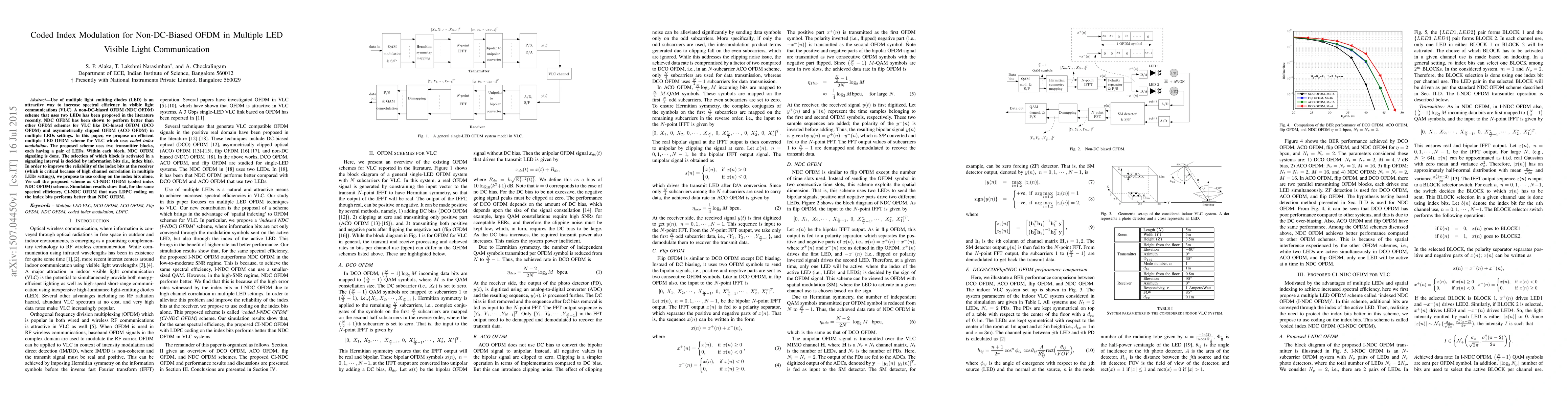 This paper proposes a coded index modulation (CI-NDC OFDM) scheme for non-DC-biased OFDM in multiple LED visible light communication, using two transmitter blocks with pairs of LEDs. The scheme employs coding on index bits to enhance reliability, showing improved performance over traditional NDC OFDM in terms of spectral efficiency and reliability.