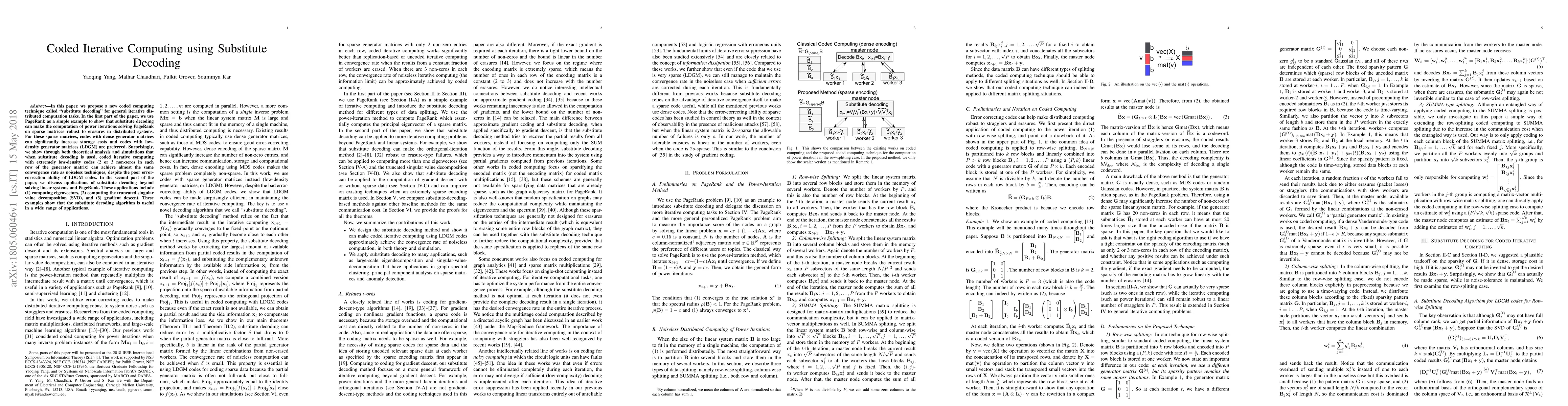 In this paper, we propose a new coded computing technique called "substitute decoding" for general iterative distributed computation tasks. In the first part of the paper, we use PageRank as a simple example to show that substitute decoding can make the computation of power iterations solving PageRank on sparse matrices robust to erasures in distributed systems. For these sparse matrices, codes with dense generator matrices can significantly increase storage costs and codes with low-density generator matrices (LDGM) are preferred. Surprisingly, we show through both theoretical analysis and simulations that when substitute decoding is used, coded iterative computing with extremely low-density codes (2 or 3 non-zeros in each row of the generator matrix) can achieve almost the same convergence rate as noiseless techniques, despite the poor error-correction ability of LDGM codes. In the second part of the paper, we discuss applications of substitute decoding beyond solving linear systems and PageRank. These applications include (1) computing eigenvectors, (2) computing the truncated singular value decomposition (SVD), and (3) gradient descent. These examples show that the substitute decoding algorithm is useful in a wide range of applications.