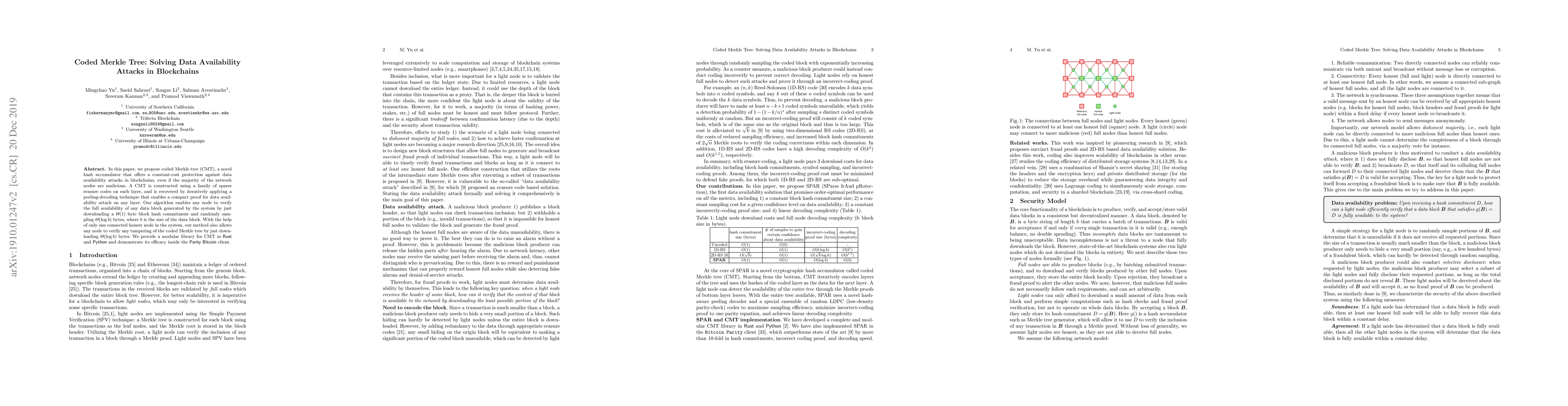 This paper proposes a coded Merkle tree (CMT) to protect blockchains against data availability attacks, using sparse erasure codes and a peeling-decoding technique. The CMT allows nodes to verify data availability with minimal data downloads and can detect tampering with the help of a single honest node.