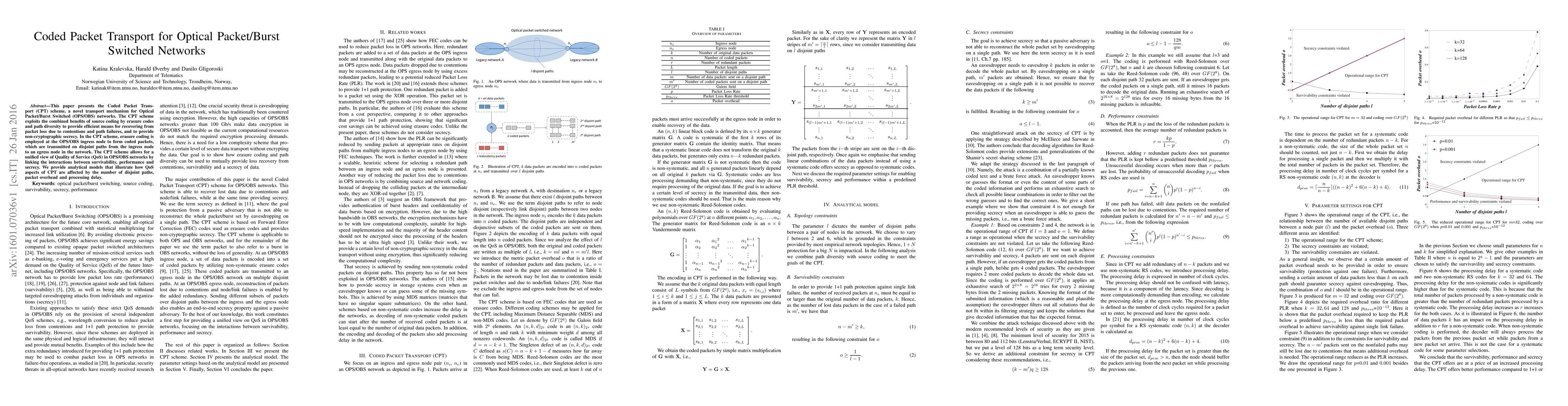 This paper introduces the Coded Packet Transport (CPT) scheme for Optical Packet/Burst Switched networks, leveraging erasure coding and path diversity to recover from packet loss and enhance network security. Analytical models demonstrate the impact of path diversity, packet overhead, and processing delay on Quality of Service (QoS).