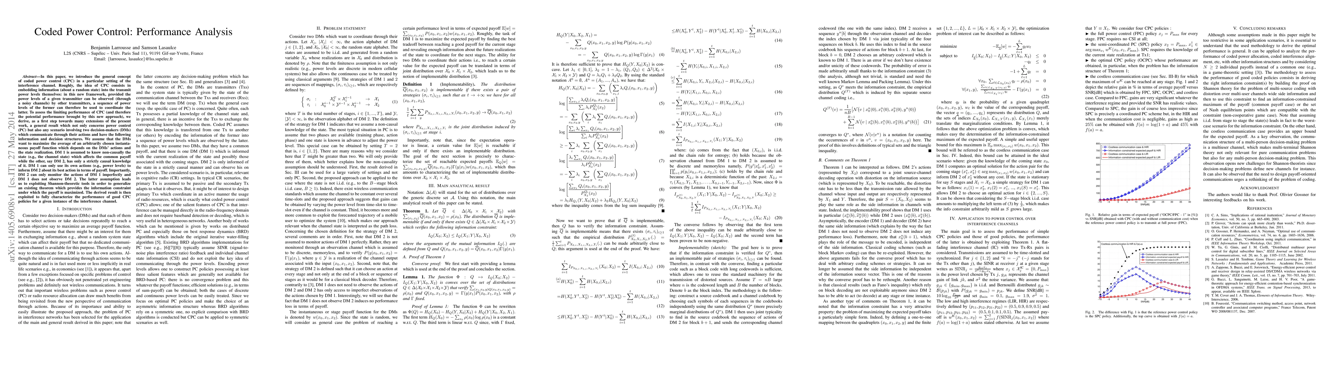 In this paper, we introduce the general concept of coded power control (CPC) in a particular setting of the interference channel. Roughly, the idea of CPC consists in embedding information (about a random state) into the transmit power levels themselves: in this new framework, provided the power levels of a given transmitter can be observed (through a noisy channels) by other transmitters, a sequence of power levels of the former can therefore be used to coordinate the latter. To assess the limiting performance of CPC (and therefore the potential performance brought by this new approach), we derive, as a first step towards many extensions of the present work, a general result which not only concerns power control (PC) but also any scenario involving two decision-makers (DMs) which communicate through their actions and have the following information and decision structures. We assume that the DMs want to maximize the average of an arbitrarily chosen instantaneous payoff function which depends on the DMs' actions and the state realization. DM 1 is assumed to know non-causally the state (e.g., the channel state) which affects the common payoff while the other, say DM 2, has only a strictly causal knowledge of it. DM 1 can only use its own actions (e.g., power levels) to inform DM 2 about its best action in terms of payoff. Importantly, DM 2 can only monitor the actions of DM 1 imperfectly and DM 1 does not observe DM 2. The latter assumption leads us to exploiting Shannon-theoretic tools in order to generalize an existing theorem which provides the information constraint under which the payoff is maximized. The derived result is then exploited to fully characterize the performance of good CPC policies for a given instance of the interference channel.