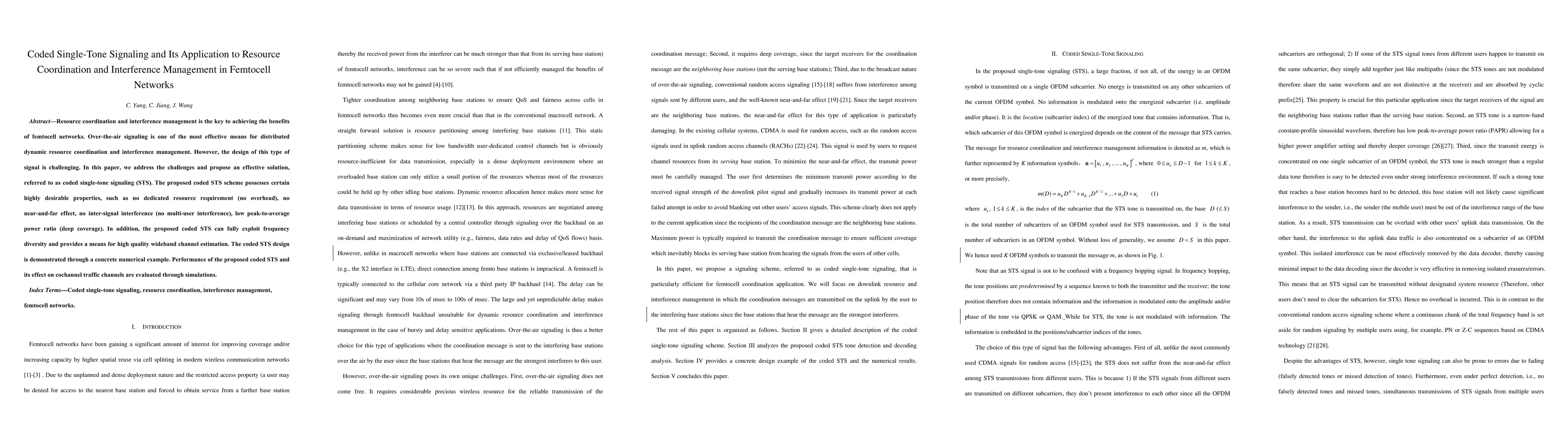 This paper proposes a coded single-tone signaling (STS) scheme for resource coordination and interference management in femtocell networks, offering benefits like no overhead, deep coverage, and high-quality wideband channel estimation. Simulation results demonstrate its effectiveness in managing cochannel traffic.