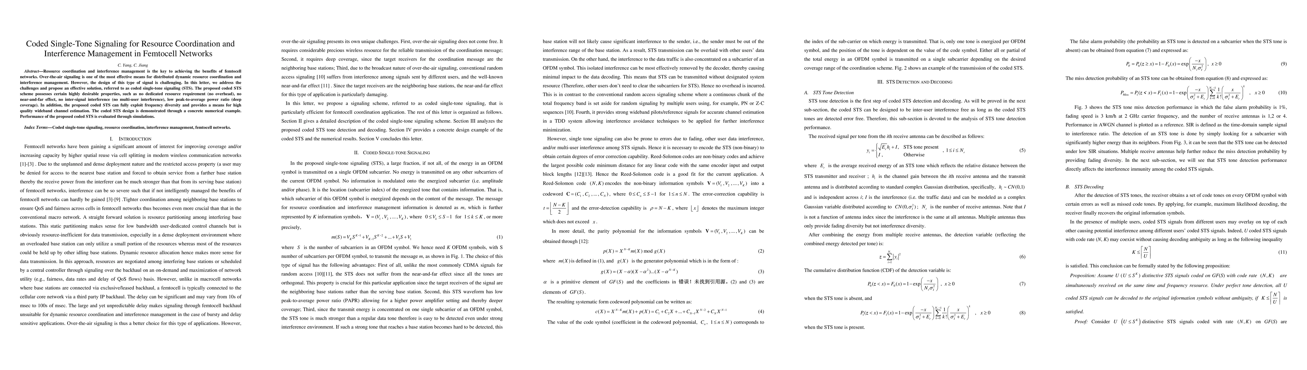 This paper proposes coded single-tone signaling (STS) for resource coordination and interference management in femtocell networks, addressing challenges with no overhead, no near-and-far effect, and low peak-to-average power ratio. The STS method leverages frequency diversity for high-quality wideband channel estimation, demonstrated through simulations.