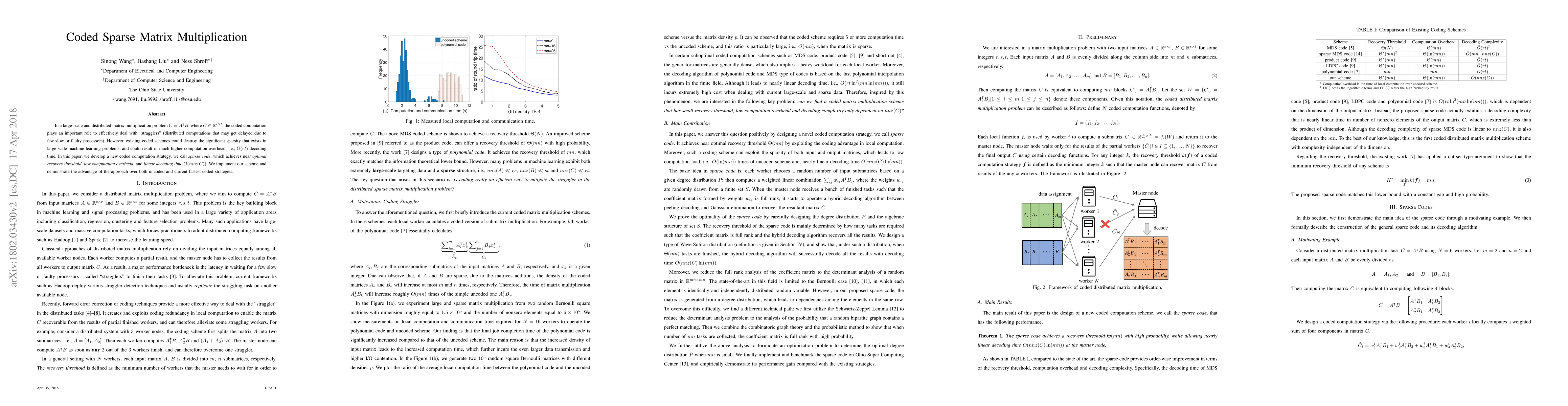 This paper introduces a new "sparse code" strategy for coded sparse matrix multiplication to handle stragglers efficiently while preserving sparsity and reducing computation overhead, achieving near-optimal recovery, low computation cost, and linear decoding time $O(nnz(C))$. The proposed method outperforms both uncoded and existing fastest coded strategies.
