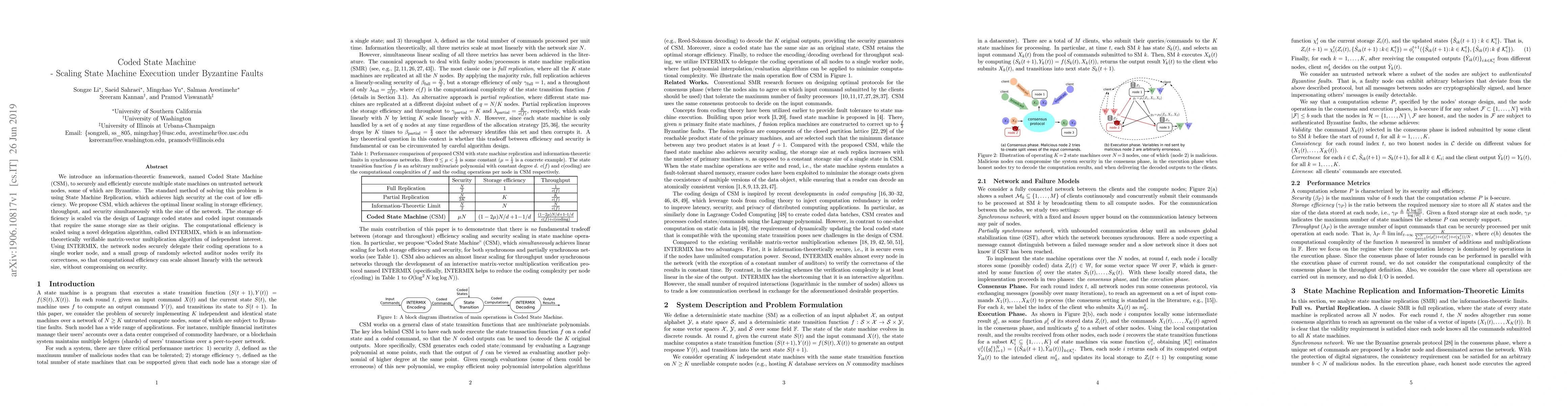 The paper introduces Coded State Machine (CSM), an information-theoretic framework for executing state machines on untrusted nodes, achieving optimal linear scaling in storage efficiency, throughput, and security. CSM uses Lagrange coded states and a novel delegation algorithm, INTERMIX, to ensure computational efficiency scales almost linearly with network size while maintaining security.
