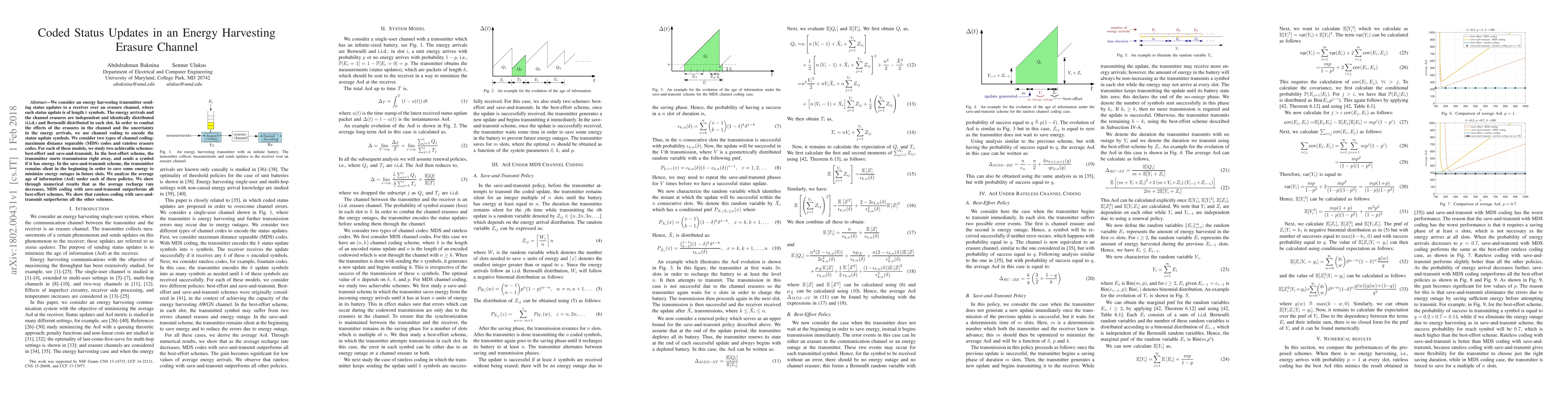 This paper explores the use of channel coding for status updates in an energy harvesting transmitter over an erasure channel, comparing MDS and rateless erasure codes. It evaluates two schemes: best-effort and save-and-transmit, finding that save-and-transmit strategies outperform best-effort in low-energy scenarios.