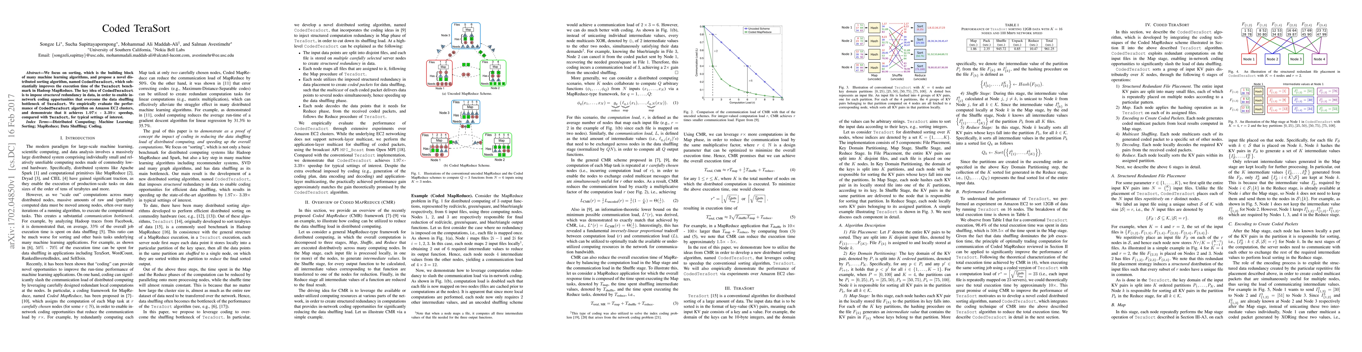 We focus on sorting, which is the building block of many machine learning algorithms, and propose a novel distributed sorting algorithm, named Coded TeraSort, which substantially improves the execution time of the TeraSort benchmark in Hadoop MapReduce. The key idea of Coded TeraSort is to impose structured redundancy in data, in order to enable in-network coding opportunities that overcome the data shuffling bottleneck of TeraSort. We empirically evaluate the performance of CodedTeraSort algorithm on Amazon EC2 clusters, and demonstrate that it achieves 1.97x - 3.39x speedup, compared with TeraSort, for typical settings of interest.