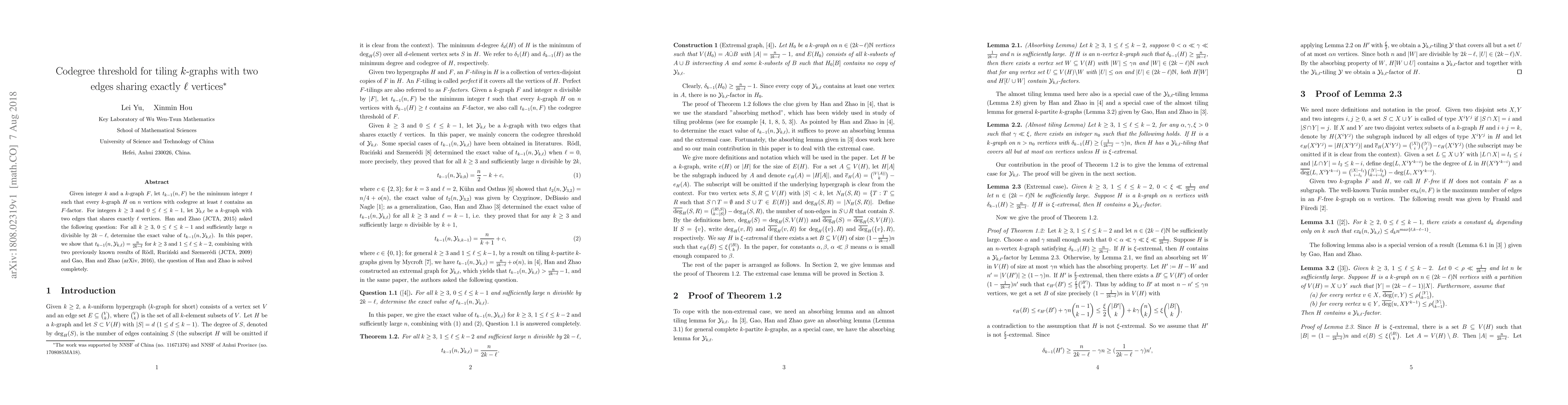 The research paper determines the exact value of a threshold for tiling k-graphs with two edges sharing exactly θ vertices, solving a question posed by Han and Zhao in 2015.