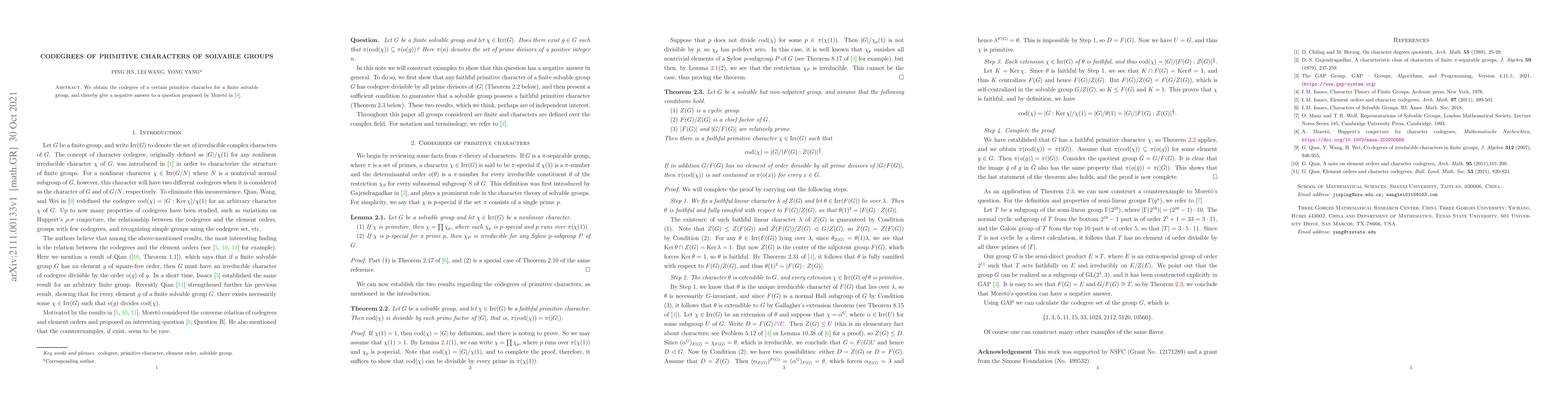 This paper determines the codegree of a specific primitive character in finite solvable groups, providing a negative resolution to a question posed by Moretó. The findings advance the understanding of character theory within solvable groups.