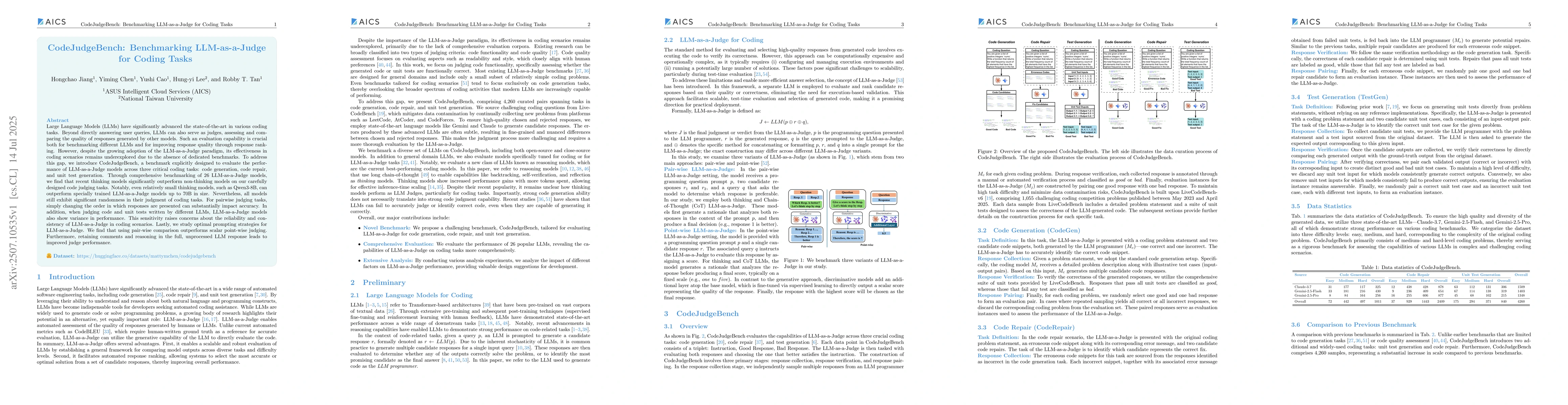 Large Language Models (LLMs) have significantly advanced the state-of-the-art in various coding tasks. Beyond directly answering user queries, LLMs can also serve as judges, assessing and comparing the quality of responses generated by other models. Such an evaluation capability is crucial both for benchmarking different LLMs and for improving response quality through response ranking. However, despite the growing adoption of the LLM-as-a-Judge paradigm, its effectiveness in coding scenarios remains underexplored due to the absence of dedicated benchmarks. To address this gap, we introduce CodeJudgeBench, a benchmark explicitly designed to evaluate the performance of LLM-as-a-Judge models across three critical coding tasks: code generation, code repair, and unit test generation. Through comprehensive benchmarking of 26 LLM-as-a-Judge models, we find that recent thinking models significantly outperform non-thinking models on our carefully designed code judging tasks. Notably, even relatively small thinking models, such as Qwen3-8B, can outperform specially trained LLM-as-a-Judge models up to 70B in size. Nevertheless, all models still exhibit significant randomness in their judgment of coding tasks. For pairwise judging tasks, simply changing the order in which responses are presented can substantially impact accuracy. In addition, when judging code and unit tests written by different LLMs, LLM-as-a-Judge models also show variance in performance. This sensitivity raises concerns about the reliability and consistency of LLM-as-a-Judge in coding scenarios. Lastly, we study optimal prompting strategies for LLM-as-a-Judge. We find that using pair-wise comparison outperforms scalar point-wise judging. Furthermore, retaining comments and reasoning in the full, unprocessed LLM response leads to improved judge performance.