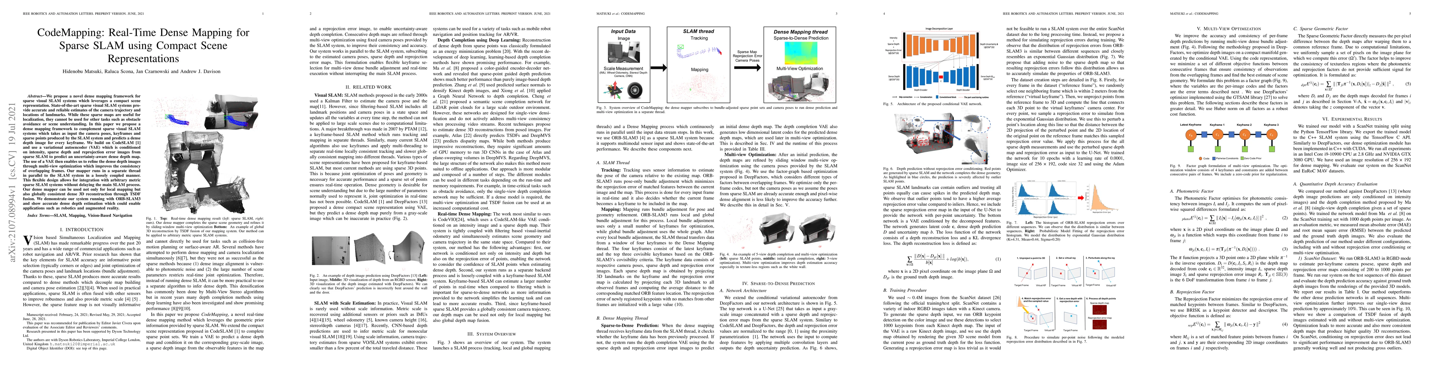 We propose a novel dense mapping framework for sparse visual SLAM systems which leverages a compact scene representation. State-of-the-art sparse visual SLAM systems provide accurate and reliable estimates of the camera trajectory and locations of landmarks. While these sparse maps are useful for localization, they cannot be used for other tasks such as obstacle avoidance or scene understanding. In this paper we propose a dense mapping framework to complement sparse visual SLAM systems which takes as input the camera poses, keyframes and sparse points produced by the SLAM system and predicts a dense depth image for every keyframe. We build on CodeSLAM and use a variational autoencoder (VAE) which is conditioned on intensity, sparse depth and reprojection error images from sparse SLAM to predict an uncertainty-aware dense depth map. The use of a VAE then enables us to refine the dense depth images through multi-view optimization which improves the consistency of overlapping frames. Our mapper runs in a separate thread in parallel to the SLAM system in a loosely coupled manner. This flexible design allows for integration with arbitrary metric sparse SLAM systems without delaying the main SLAM process. Our dense mapper can be used not only for local mapping but also globally consistent dense 3D reconstruction through TSDF fusion. We demonstrate our system running with ORB-SLAM3 and show accurate dense depth estimation which could enable applications such as robotics and augmented reality.