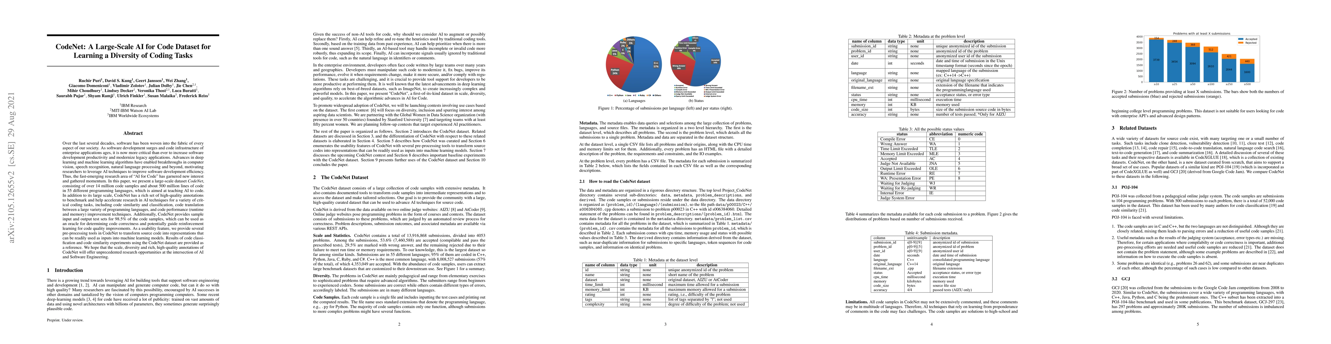 Over the last several decades, software has been woven into the fabric of every aspect of our society. As software development surges and code infrastructure of enterprise applications ages, it is now more critical than ever to increase software development productivity and modernize legacy applications. Advances in deep learning and machine learning algorithms have enabled numerous breakthroughs, motivating researchers to leverage AI techniques to improve software development efficiency. Thus, the fast-emerging research area of AI for Code has garnered new interest and gathered momentum. In this paper, we present a large-scale dataset CodeNet, consisting of over 14 million code samples and about 500 million lines of code in 55 different programming languages, which is aimed at teaching AI to code. In addition to its large scale, CodeNet has a rich set of high-quality annotations to benchmark and help accelerate research in AI techniques for a variety of critical coding tasks, including code similarity and classification, code translation between a large variety of programming languages, and code performance (runtime and memory) improvement techniques. Additionally, CodeNet provides sample input and output test sets for 98.5% of the code samples, which can be used as an oracle for determining code correctness and potentially guide reinforcement learning for code quality improvements. As a usability feature, we provide several pre-processing tools in CodeNet to transform source code into representations that can be readily used as inputs into machine learning models. Results of code classification and code similarity experiments using the CodeNet dataset are provided as a reference. We hope that the scale, diversity and rich, high-quality annotations of CodeNet will offer unprecedented research opportunities at the intersection of AI and Software Engineering.