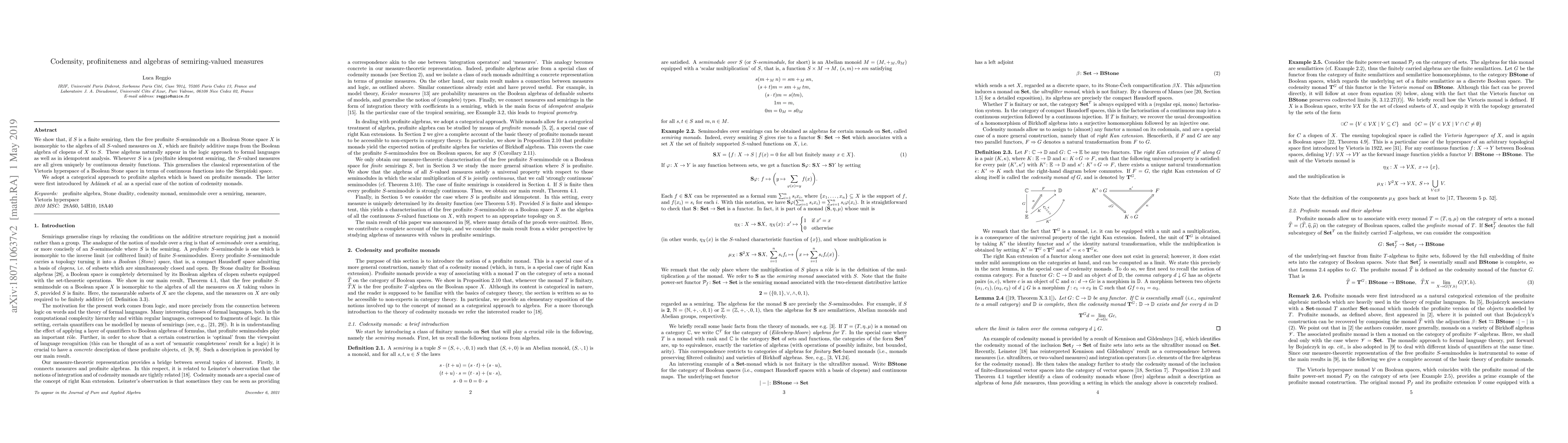 We show that, if S is a finite semiring, then the free profinite S-semimodule on a Boolean Stone space X is isomorphic to the algebra of all S-valued measures on X, which are finitely additive maps from the Boolean algebra of clopens of X to S. These algebras naturally appear in the logic approach to formal languages as well as in idempotent analysis. Whenever S is a (pro)finite idempotent semiring, the S-valued measures are all given uniquely by continuous density functions. This generalises the classical representation of the Vietoris hyperspace of a Boolean Stone space in terms of continuous functions into the Sierpinski space. We adopt a categorical approach to profinite algebra which is based on profinite monads. The latter were first introduced by Adamek et al. as a special case of the notion of codensity monads.